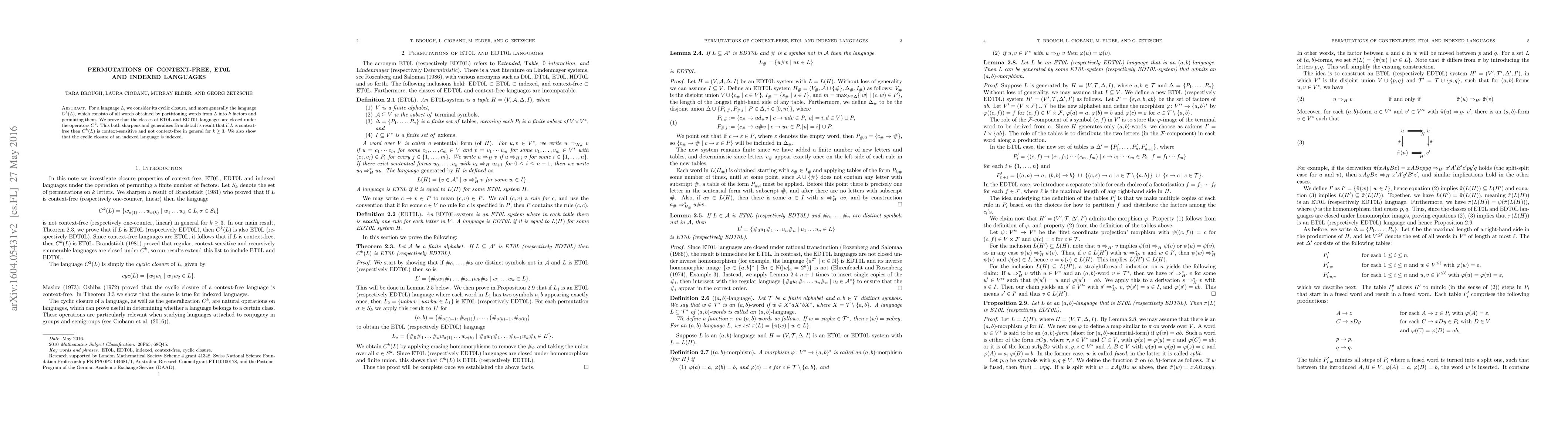 For a language $L$, we consider its cyclic closure, and more generally the language $C^k(L)$, which consists of all words obtained by partitioning words from $L$ into $k$ factors and permuting them. We prove that the classes of ET0L and EDT0L languages are closed under the operators $C^k$. This both sharpens and generalises Brandst\"adt's result that if $L$ is context-free then $C^k(L)$ is context-sensitive and not context-free in general for $k\geq 3$. We also show that the cyclic closure of an indexed language is indexed.