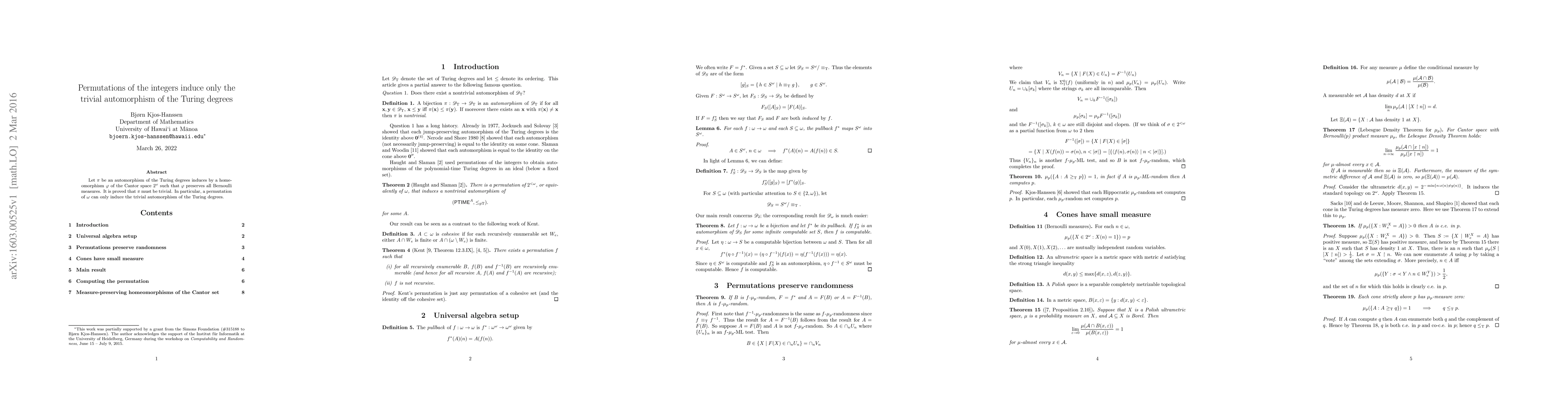 Let $\pi$ be an automorphism of the Turing degrees induces by a homeomorphism $\varphi$ of the Cantor space $2^\omega$ such that $\varphi$ preserves all Bernoulli measures. It is proved that $\pi$ must be trivial. In particular, a permutation of $\omega$ can only induce the trivial automorphism of the Turing degrees.