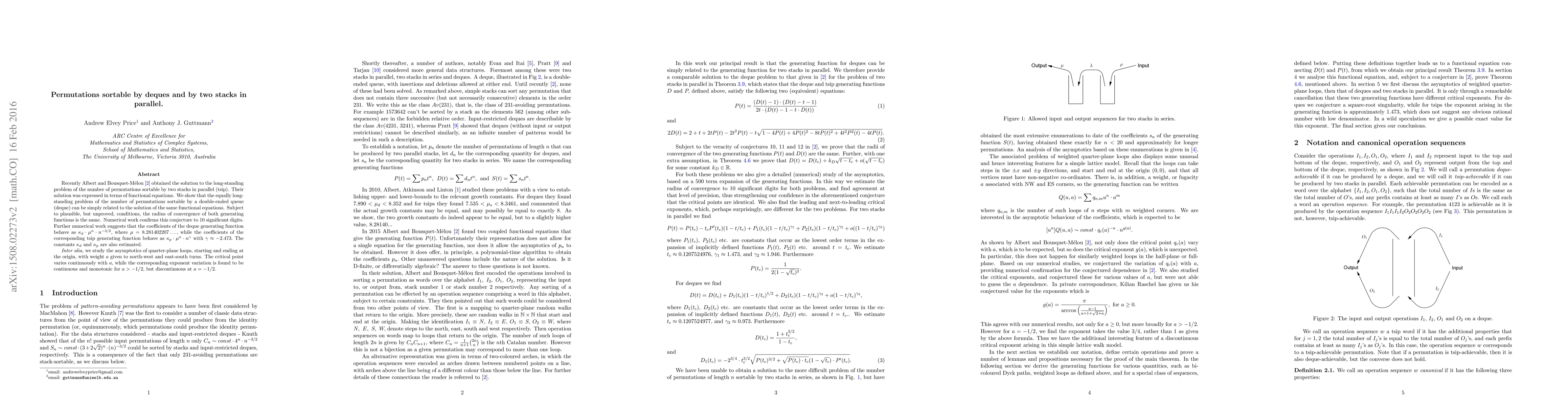 Recently Albert and Bousquet-M\'elou \cite{AB15} obtained the solution to the long-standing problem of the number of permutations sortable by two stacks in parallel (tsip). Their solution was expressed in terms of functional equations. We show that the equally long-standing problem of the number of permutations sortable by a double-ended queue (deque) can be simply related to the solution of the same functional equations. Subject to plausible, but unproved, conditions, the radius of convergence of both generating functions is the same. Numerical work confirms this conjecture to 10 significant digits. Further numerical work suggests that the coefficients of the deque generating function behave as $\kappa_d \cdot \mu^n \cdot n^{-3/2},$ where $\mu = 8.281402207\ldots,$ while the coefficients of the corresponding tsip generating function behave as $\kappa_p \cdot \mu^n \cdot n^{\gamma}$ with $\gamma \approx -2.473.$ The constants $\kappa_d$ and $\kappa_p$ are also estimated. {\em Inter alia,} we study the asymptotics of quarter-plane loops, starting and ending at the origin, with weight $a$ given to north-west and east-south turns. The critical point varies continuously with $a,$ while the corresponding exponent variation is found to be continuous and monotonic for $a > -1/2,$ but discontinuous at $a=-1/2.$