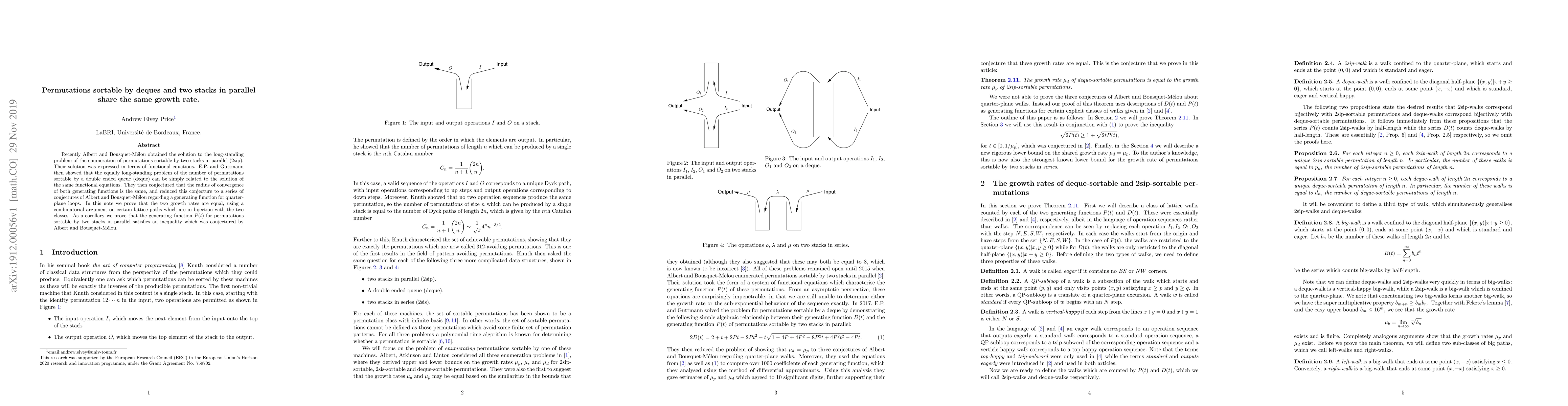 Recently Albert and Bousquet-M\'elou obtained the solution to the long-standing problem of the enumeration of permutations sortable by two stacks in parallel (2sip). Their solution was expressed in terms of functional equations. E.P. and Guttmann then showed that the equally long-standing problem of the number of permutations sortable by a double ended queue (deque) can be simply related to the solution of the same functional equations. They then conjectured that the radius of convergence of both generating functions is the same, and reduced this conjecture to a series of conjectures of Albert and Bousquet-M\'elou regarding a generating function for quarter-plane loops. In this note we prove that the two growth rates are equal, using a combinatorial argument on certain lattice paths which are in bijection with the two classes. As a corollary we prove that the generating function P(t) for permutations sortable by two stacks in parallel satisfies an inequality which was conjectured by Albert and Bousquet-M\'elou.