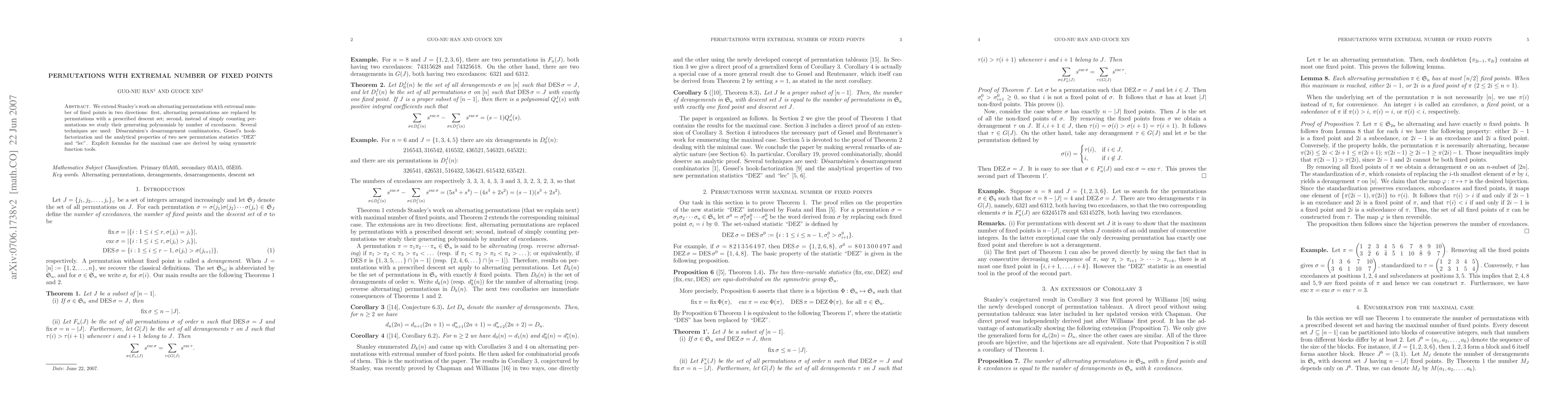 We extend Stanley's work on alternating permutations with extremal number of fixed points in two directions: first, alternating permutations are replaced by permutations with a prescribed descent set; second, instead of simply counting permutations we study their generating polynomials by number of excedances. Several techniques are used: Desarmenien's desarrangement combinatorics, Gessel's hook-factorization and the analytical properties of two new permutation statistics "DEZ" and "lec". Explicit formulas for the maximal case are derived by using symmetric function tools.