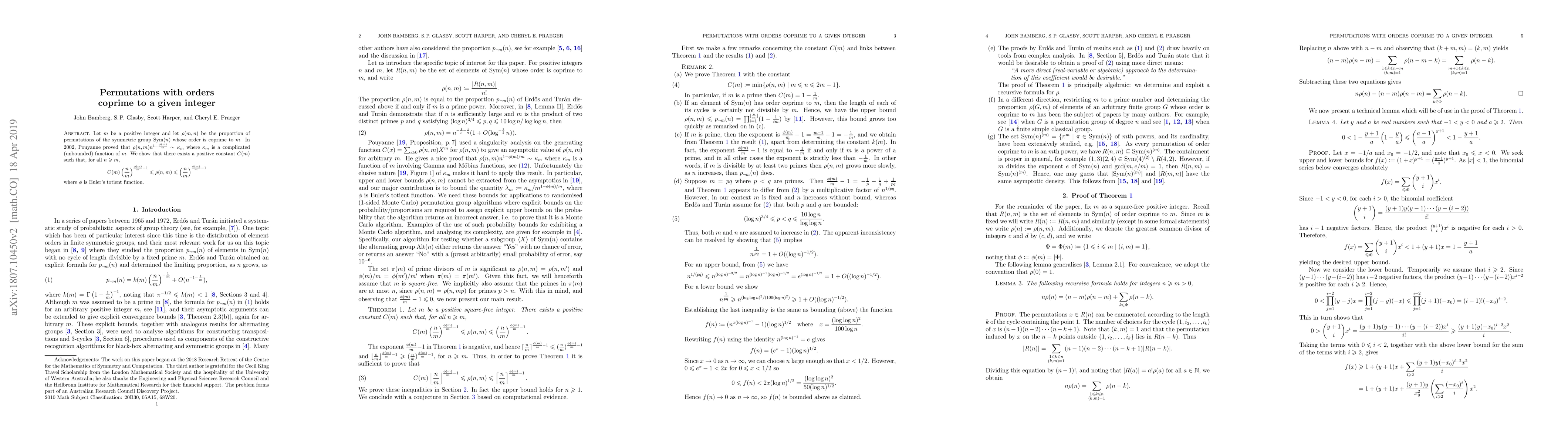 Researchers found a positive constant $C(m)$ that bounds the proportion of permutations whose order is coprime to $m$, providing an upper and lower bound for $ ho(n,m)$. The bound depends on Euler's totient function $rac{eta(m)}{m}$.