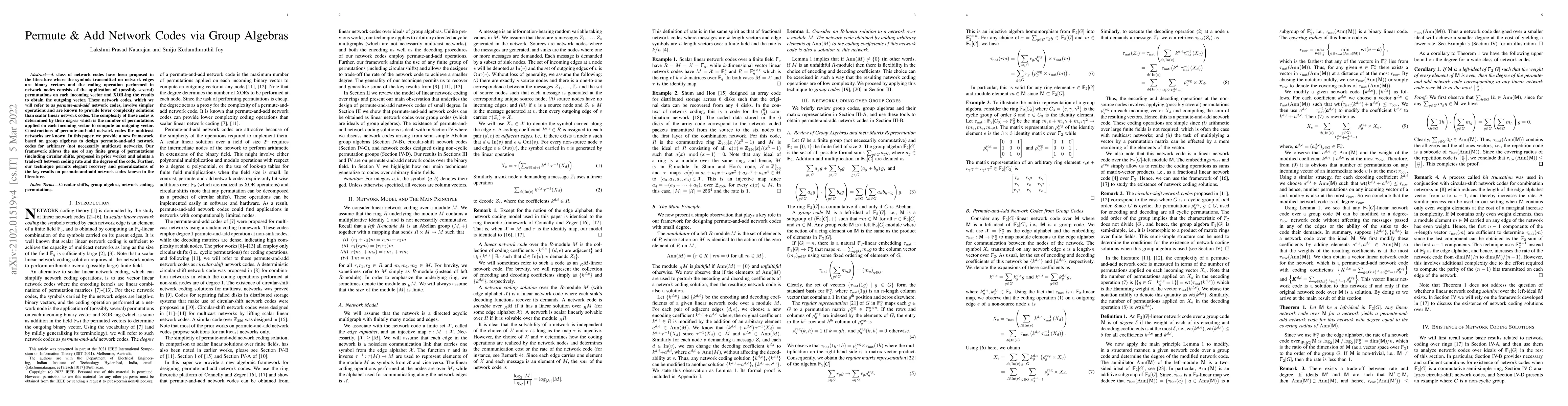 A class of network codes have been proposed in the literature where the symbols transmitted on network edges are binary vectors and the coding operation performed in network nodes consists of the application of (possibly several) permutations on each incoming vector and XOR-ing the results to obtain the outgoing vector. These network codes, which we will refer to as "permute-and-add" network codes, involve simpler operations and are known to provide lower complexity solutions than scalar linear network codes. The complexity of these codes is determined by their "degree" which is the number of permutations applied on each incoming vector to compute an outgoing vector. Constructions of permute-and-add network codes for multicast networks are known. In this paper, we provide a new framework based on group algebras to design permute-and-add network codes for arbitrary (not necessarily multicast) networks. Our framework allows the use of any finite group of permutations (including circular shifts, proposed in prior works) and admits a trade-off between coding rate and the degree of the code. Further, our technique permits elegant recovery and generalizations of the key results on permute-and-add network codes known in the literature.