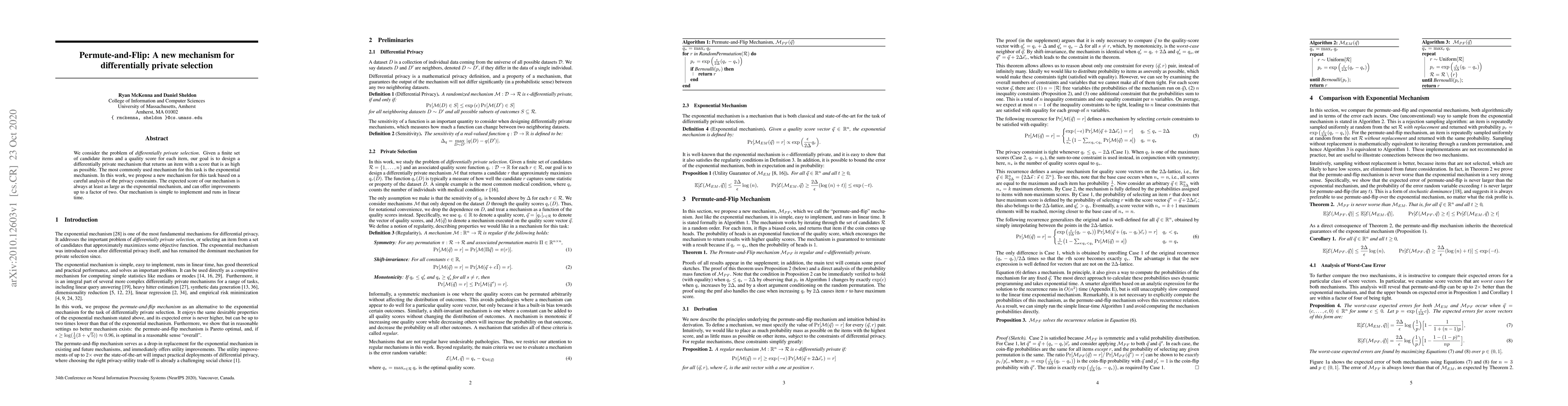 This paper introduces a new differentially private selection mechanism called Permute-and-Flip, which aims to return items with higher quality scores compared to the commonly used exponential mechanism. The proposed method offers potential improvements up to a factor of two in expected score while maintaining linear runtime and ease of implementation.