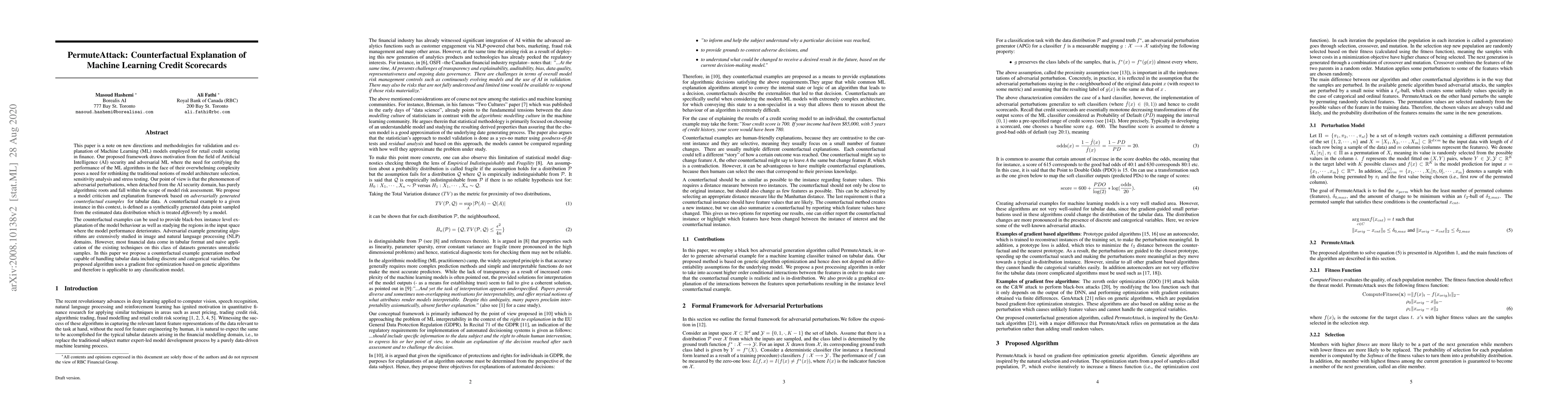 This paper is a note on new directions and methodologies for validation and explanation of Machine Learning (ML) models employed for retail credit scoring in finance. Our proposed framework draws motivation from the field of Artificial Intelligence (AI) security and adversarial ML where the need for certifying the performance of the ML algorithms in the face of their overwhelming complexity poses a need for rethinking the traditional notions of model architecture selection, sensitivity analysis and stress testing. Our point of view is that the phenomenon of adversarial perturbations when detached from the AI security domain, has purely algorithmic roots and fall within the scope of model risk assessment. We propose a model criticism and explanation framework based on adversarially generated counterfactual examples for tabular data. A counterfactual example to a given instance in this context is defined as a synthetically generated data point sampled from the estimated data distribution which is treated differently by a model. The counterfactual examples can be used to provide a black-box instance-level explanation of the model behaviour as well as studying the regions in the input space where the model performance deteriorates. Adversarial example generating algorithms are extensively studied in the image and natural language processing (NLP) domains. However, most financial data come in tabular format and naive application of the existing techniques on this class of datasets generates unrealistic samples. In this paper, we propose a counterfactual example generation method capable of handling tabular data including discrete and categorical variables. Our proposed algorithm uses a gradient-free optimization based on genetic algorithms and therefore is applicable to any classification model.
