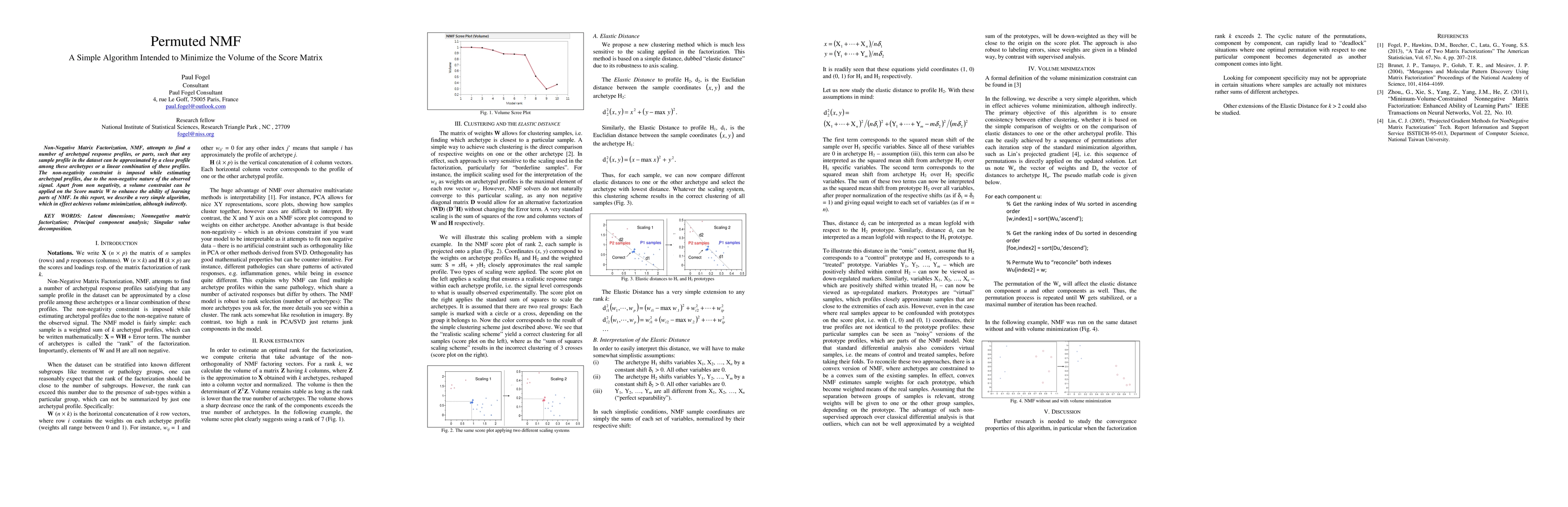 Non-Negative Matrix Factorization, NMF, attempts to find a number of archetypal response profiles, or parts, such that any sample profile in the dataset can be approximated by a close profile among these archetypes or a linear combination of these profiles. The non-negativity constraint is imposed while estimating archetypal profiles, due to the non-negative nature of the observed signal. Apart from non negativity, a volume constraint can be applied on the Score matrix W to enhance the ability of learning parts of NMF. In this report, we describe a very simple algorithm, which in effect achieves volume minimization, although indirectly.