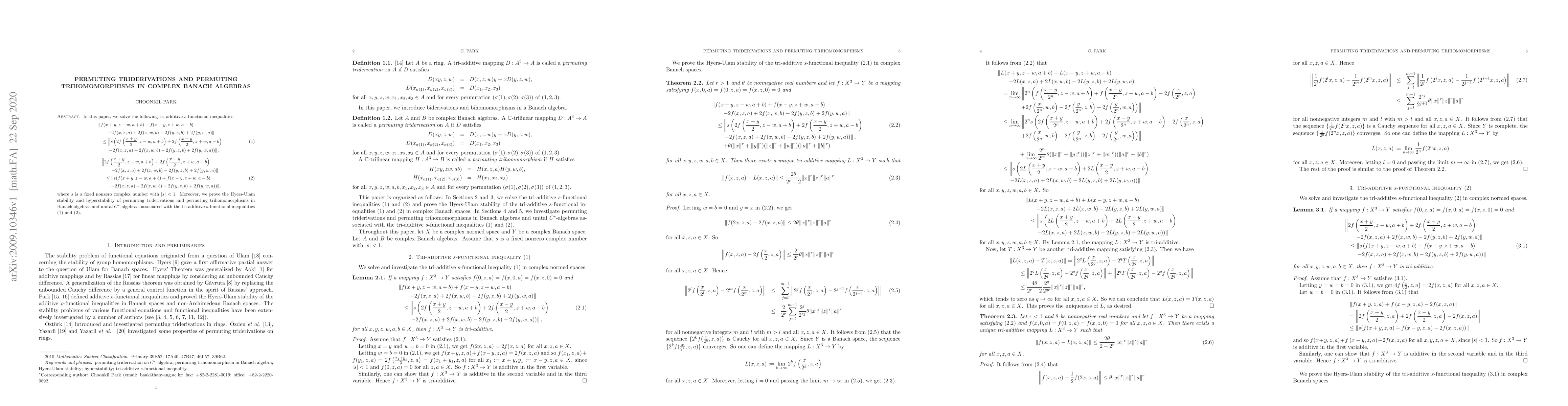 In this paper, we solve the following tri-additive $s$-functional inequalities \begin{eqnarray}\label{0.1} && \nonumber \| f(x+y, z-w, a+b) + f(x-y, z+w, a-b) \\ && \nonumber\qquad -2 f(x, z, a) + 2 f(x, w, b) -2f(y, z, b) +2 f(y, w, a)\| \\ && \quad \le \left \|s \left(2f\left(\frac{x+y}{2}, z-w, a+b \right) + 2f\left(\frac{x-y}{2}, z+w, a-b\right) \right. \right. \\ && \qquad \left. \left. -2 f(x, z, a) + 2 f(x, w, b) -2f(y, z, b) +2 f(y, w, a)\right)\right\| , \nonumber \end{eqnarray} \begin{eqnarray}\label{0.2} && \nonumber \left\|2f\left(\frac{x+y}{2}, z-w, a+b \right) + 2f\left(\frac{x-y}{2}, z+w, a-b\right) \right. \\ && \nonumber \qquad \left. -2 f(x, z, a) + 2 f(x, w, b) -2f(y, z, b) +2 f(y, w, a)\right\| \\ && \quad \le \|s ( f(x+y, z-w, a+b) + f(x-y, z+w, a-b) \\ && \nonumber\qquad -2 f(x, z, a) + 2 f(x, w, b) -2f(y, z, b) +2 f(y, w, a) )\| , \end{eqnarray} where $s$ is a fixed nonzero complex number with $|s |< 1$. Moreover, we prove the Hyers-Ulam stability and hyperstability of permuting triderivations and permuting trihomomorphisms in Banach algebras and unital $C^*$-algebras, associated with the tri-additive $s$-functional inequalities {\rm (\ref{0.1})} and {\rm (\ref{0.2})}.