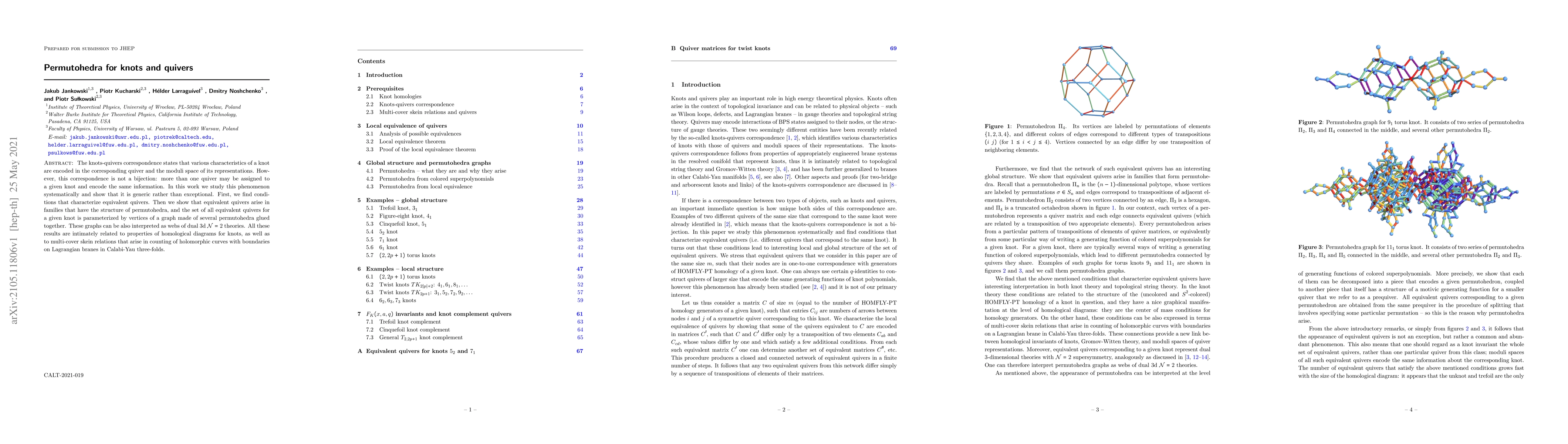 This paper explores the correspondence between knot characteristics and quivers, demonstrating that equivalent quivers arise in families structured like permutohedra. It shows that the set of equivalent quivers for a given knot can be parameterized by vertices of a graph composed of glued permutohedra, linking these results to homological diagrams and 3d $\mathcal{N}=2$ theories.