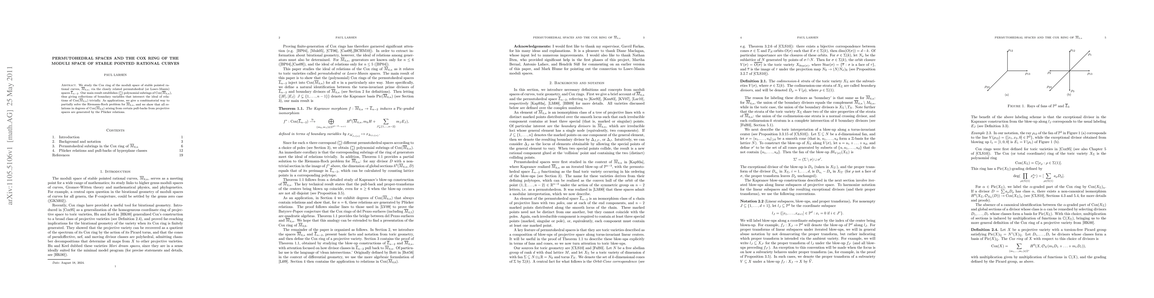 This paper investigates the Cox ring of the moduli space of stable pointed rational curves, \M_{0,n}, utilizing permutohedral spaces. The study identifies \binom{n}{2} polynomial subrings in the Cox ring, leading to a combinatorial approach for solving the Riemann-Roch problem for \M_{0,n} and demonstrating that Cox(\M_{0,6}) relations are generated by Plucker relations.