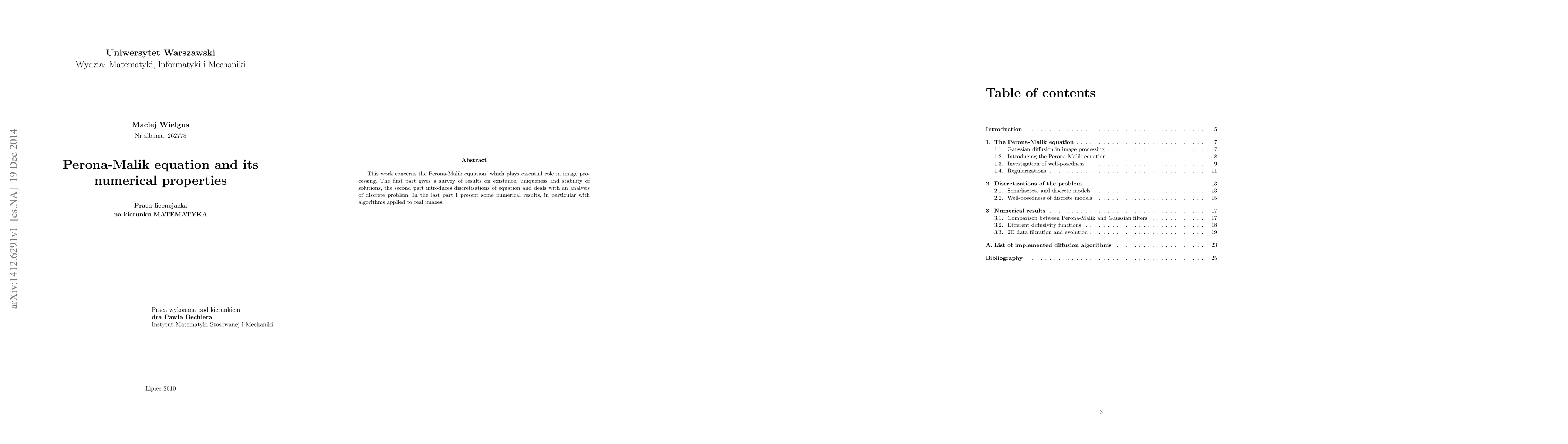 This work concerns the Perona-Malik equation, which plays essential role in image processing. The first part gives a survey of results on existance, uniqueness and stability of solutions, the second part introduces discretisations of equation and deals with an analysis of discrete problem. In the last part I present some numerical results, in particular with algorithms applied to real images.