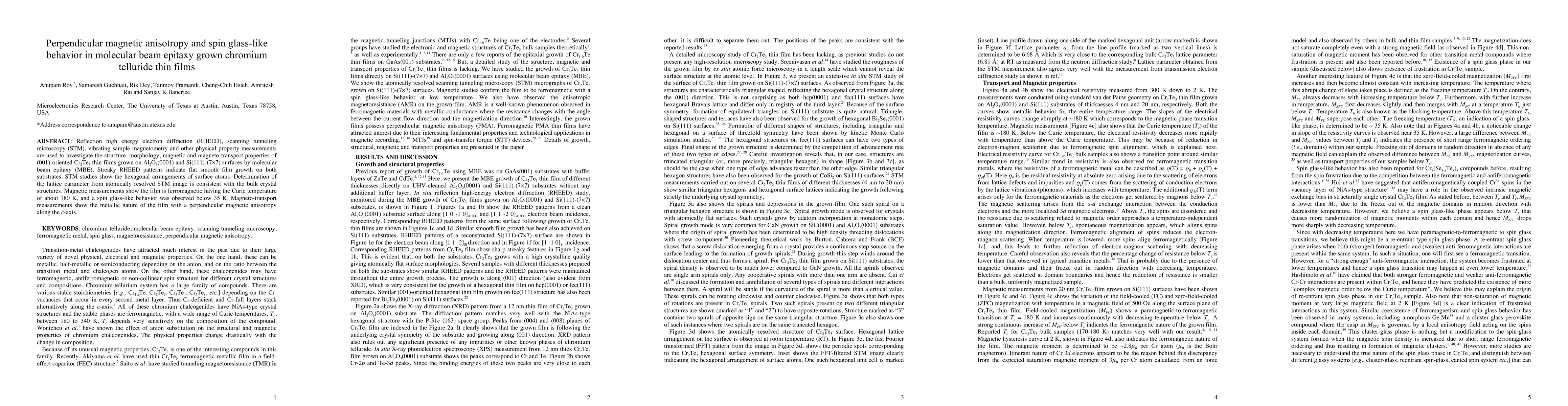 Reflection high energy electron diffraction (RHEED), scanning tunneling microscopy (STM), vibrating sample magnetometry and other physical property measurements are used to investigate the structure, morphology, magnetic and magneto-transport properties of (001)-oriented Cr$_2$Te$_3$ thin films grown on Al$_2$O$_3$(0001) and Si(111)-(7$\times$7) surfaces by molecular beam epitaxy (MBE). Streaky RHEED patterns indicate flat smooth film growth on both substrates. STM studies show the hexagonal arrangements of surface atoms. Determination of the lattice parameter from atomically resolved STM image is consistent with the bulk crystal structures. Magnetic measurements show the film is ferromagnetic having the Curie temperature of about 180 K, and a spin glass-like behavior was observed below 35 K. Magneto-transport measurements show the metallic nature of the film with a perpendicular magnetic anisotropy along the $c$-axis.
