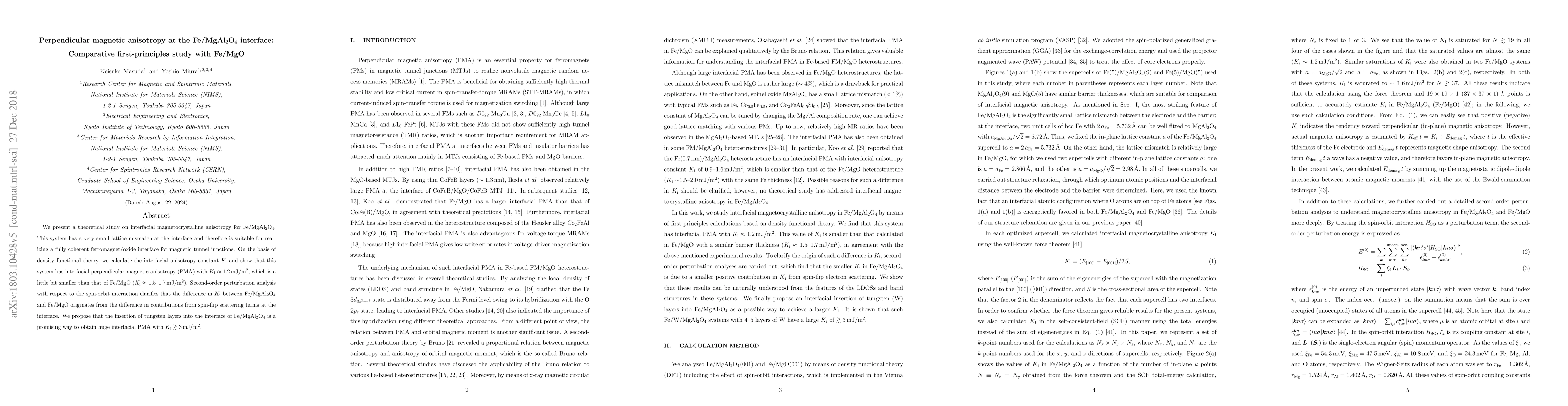 This study uses density functional theory to investigate the interfacial magnetocrystalline anisotropy of Fe/MgAl$_2$O$_4$, revealing a small lattice mismatch and perpendicular magnetic anisotropy with $K_{\rm i} \approx 1.2\,{\rm mJ/m^2}$. The difference in anisotropy compared to Fe/MgO is attributed to spin-orbit interaction differences, suggesting that inserting tungsten layers could enhance the anisotropy.