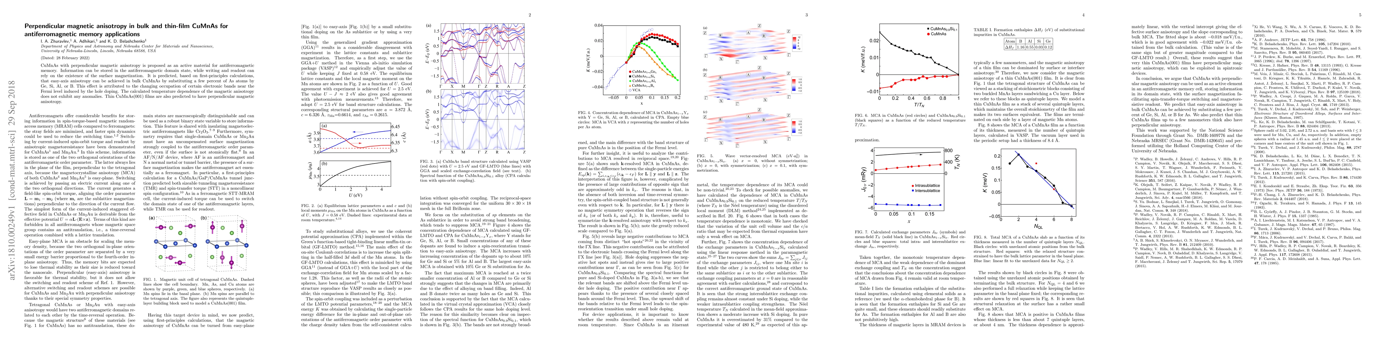 This paper proposes CuMnAs with engineered perpendicular magnetic anisotropy for antiferromagnetic memory applications, where data storage relies on antiferromagnetic domain states and surface magnetization. First-principles calculations predict that substituting a few percent of As atoms with Ge, Si, Al, or B can achieve this anisotropy, attributing the effect to changes in electronic band occupation near the Fermi level.