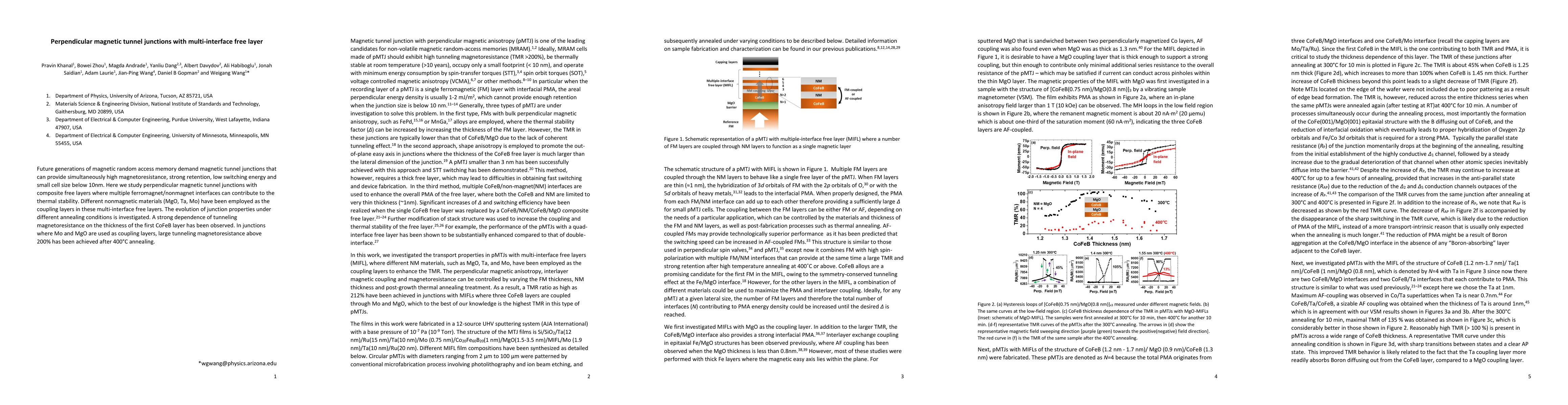 This paper investigates perpendicular magnetic tunnel junctions with multi-interface free layers to enhance memory retention and efficiency. Large tunneling magnetoresistance over 200% is achieved with Mo and MgO coupling layers after annealing at 400°C, demonstrating potential for future nanoscale magnetic random access memory.