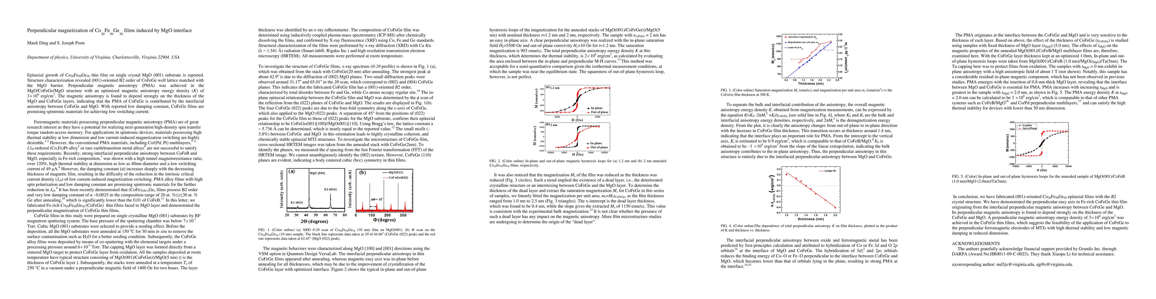 Epitaxial growth of Co20Fe50Ge30 thin film on single crystal MgO (001) substrate is reported. Structure characterization revealed (001)-oriented B2 order of CoFeGe well lattice matched with the MgO barrier. Perpendicular magnetic anisotropy (PMA) was achieved in the MgO/CoFeGe/MgO structure with an optimized magnetic anisotropy energy density (K) of 3 106 erg/cm3. The magnetic anisotropy is found to depend strongly on the thickness of the MgO and CoFeGe layers, indicating that the PMA of CoFeGe is contributed by the interfacial anisotropy between CoFeGe and MgO. With reported low damping constant, CoFeGe films are promising spintronic materials for achieving low switching current.