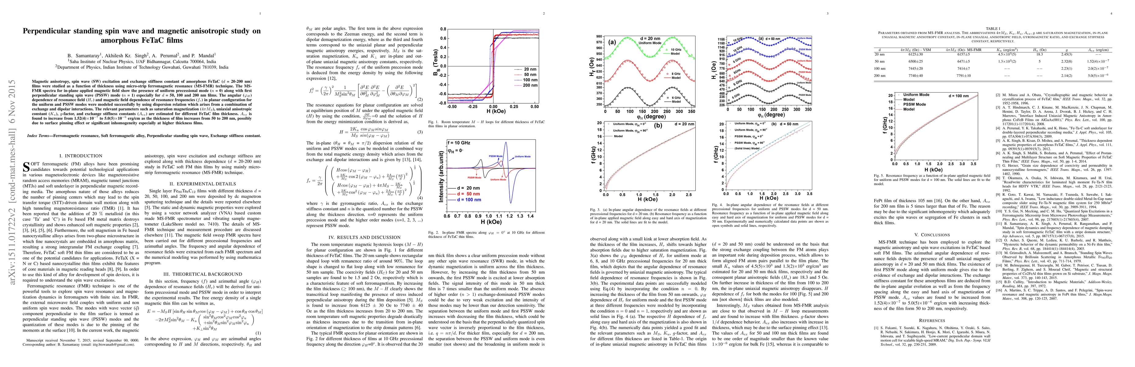 Magnetic anisotropy, spin wave (SW) excitation and exchange stiffness constant of amorphous FeTaC ($d$ = 20-200 nm) films were studied as a function of thickness using micro-strip ferromagnetic resonance (MS-FMR) technique. The MS-FMR spectra for in-plane applied magnetic field show the presence of uniform precessional mode ($n$ = 0) along with first perpendicular standing spin wave (PSSW) mode ($n$ = 1) especially for $d$ = 50, 100 and 200 nm films. The angular ($\varphi_{H}$) dependence of resonance field ($H_{r}$) and magnetic field dependence of resonance frequencies ($f_{r}$) in planar configuration for the uniform and PSSW modes were modeled successfully by using dispersion relation which arises from a combination of exchange and dipolar interactions. The relevant parameters such as saturation magnetization ($4\pi M_{S}$), uniaxial anisotropic constant ($K_{u}$), $g$-factor, and exchange stiffness constants ($A_{ex}$) are estimated for different FeTaC film thickness. $A_{ex}$ is found to increase from 1.52(4)$\times$10$^{-7}$ to 5.0(5)$\times$10$^{-6}$ erg/cm as the thickness of film increases from 50 to 200 nm, possibly due to surface pinning effect or significant inhomogeneity especially at higher thickness films.