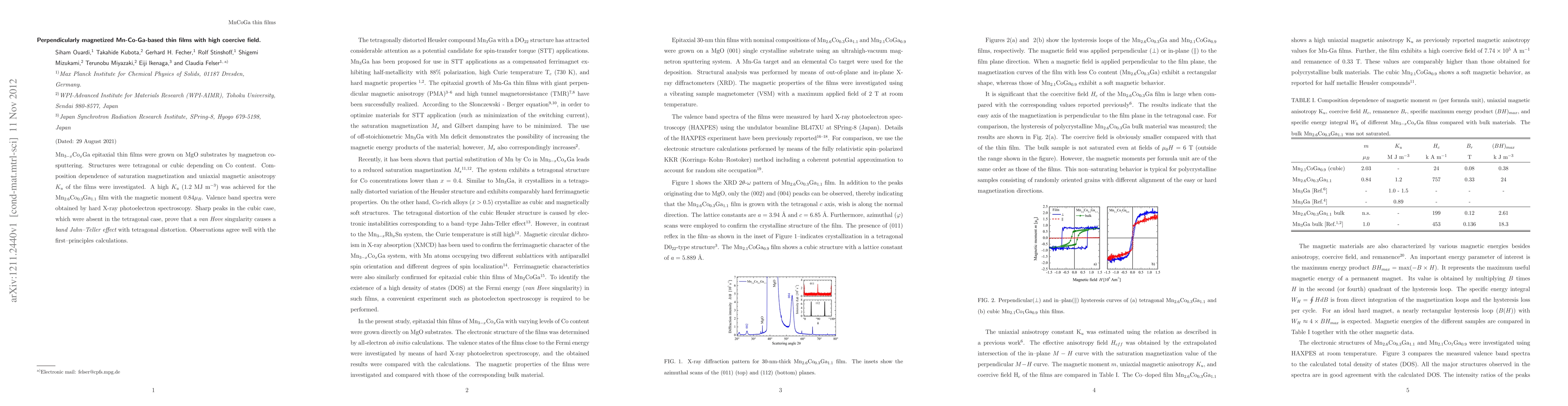 This study investigates Mn$_{3-x}$Co$_{x}$Ga thin films grown on MgO substrates, finding high uniaxial magnetic anisotropy ($K_u$ = 1.2 MJ m$^{-3}$) in Mn$_{2.6}$Co$_{0.3}$Ga$_{1.1}$ films. The presence of sharp peaks in cubic structures, confirmed by hard X-ray photoelectron spectroscopy, indicates a band Jahn-Teller effect due to a van Hove singularity.