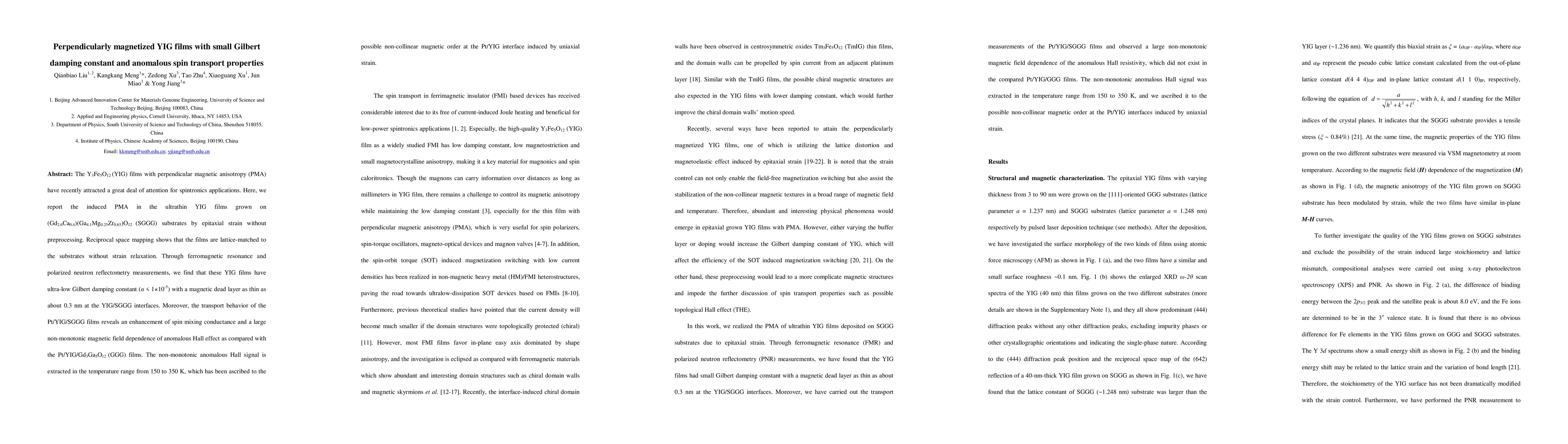 This paper reports on ultrathin YIG films with perpendicular magnetic anisotropy grown on SGGG substrates, exhibiting ultra-low Gilbert damping and a magnetic dead layer of 0.3 nm. The Pt/YIG/SGGG films show enhanced spin mixing conductance and a non-monotonic magnetic field dependence of the anomalous Hall effect, attributed to non-collinear magnetic order at the interface due to strain.