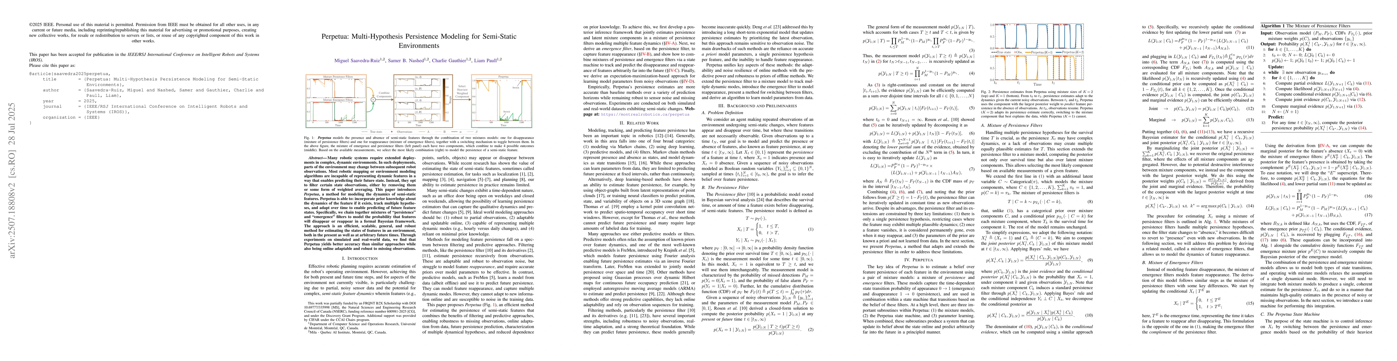 Many robotic systems require extended deployments in complex, dynamic environments. In such deployments, parts of the environment may change between subsequent robot observations. Most robotic mapping or environment modeling algorithms are incapable of representing dynamic features in a way that enables predicting their future state. Instead, they opt to filter certain state observations, either by removing them or some form of weighted averaging. This paper introduces Perpetua, a method for modeling the dynamics of semi-static features. Perpetua is able to: incorporate prior knowledge about the dynamics of the feature if it exists, track multiple hypotheses, and adapt over time to enable predicting of future feature states. Specifically, we chain together mixtures of "persistence" and "emergence" filters to model the probability that features will disappear or reappear in a formal Bayesian framework. The approach is an efficient, scalable, general, and robust method for estimating the states of features in an environment, both in the present as well as at arbitrary future times. Through experiments on simulated and real-world data, we find that Perpetua yields better accuracy than similar approaches while also being online adaptable and robust to missing observations.