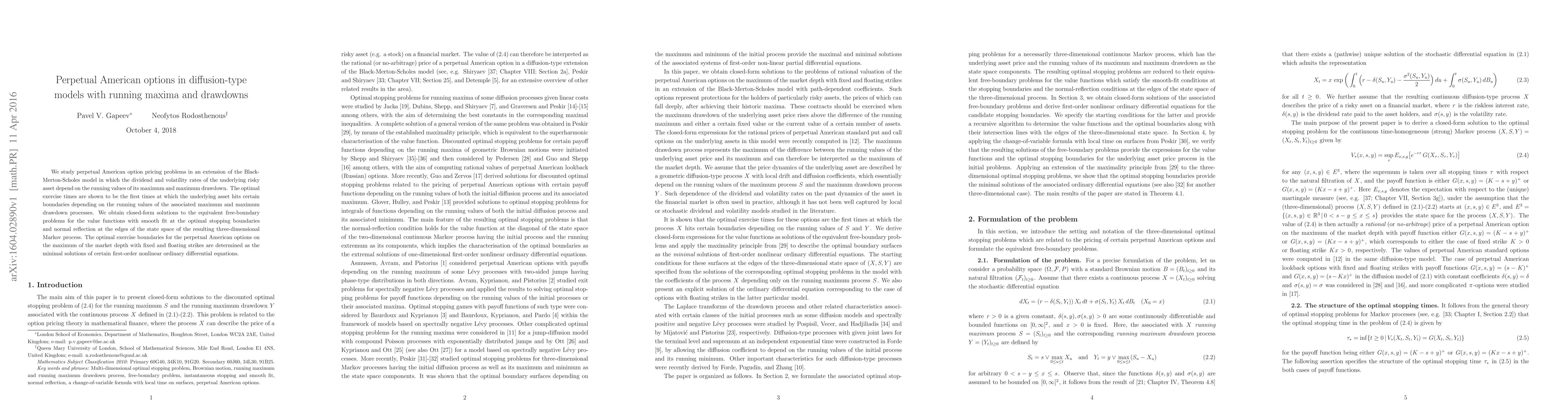 We study perpetual American option pricing problems in an extension of the Black-Merton-Scholes model in which the dividend and volatility rates of the underlying risky asset depend on the running values of its maximum and maximum drawdown. The optimal exercise times are shown to be the first times at which the underlying asset hits certain boundaries depending on the running values of the associated maximum and maximum drawdown processes. We obtain closed-form solutions to the equivalent free-boundary problems for the value functions with smooth fit at the optimal stopping boundaries and normal reflection at the edges of the state space of the resulting three-dimensional Markov process. The optimal exercise boundaries for the perpetual American options on the maximum of the market depth with fixed and floating strikes are determined as the minimal solutions of certain first-order nonlinear ordinary differential equations.