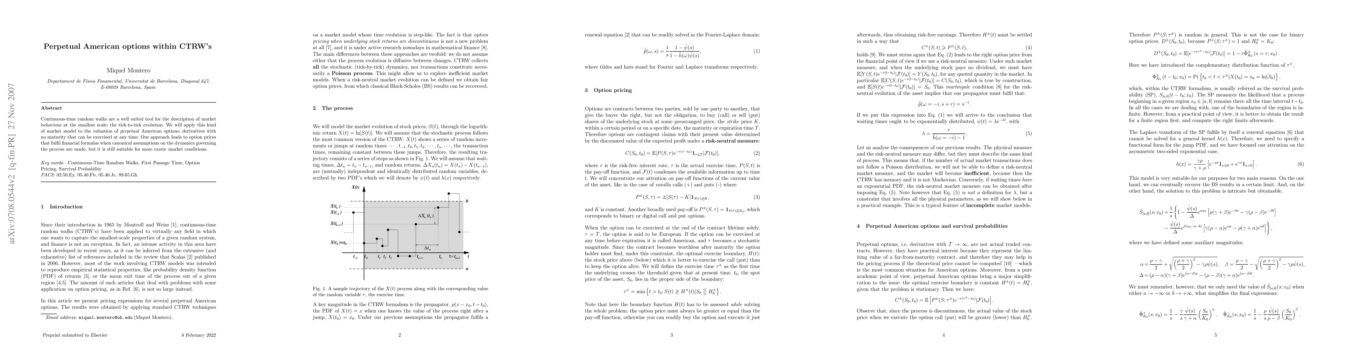 Continuous-time random walks are a well suited tool for the description of market behaviour at the smallest scale: the tick-to-tick evolution. We will apply this kind of market model to the valuation of perpetual American options: derivatives with no maturity that can be exercised at any time. Our approach leads to option prices that fulfil financial formulas when canonical assumptions on the dynamics governing the process are made, but it is still suitable for more exotic market conditions.