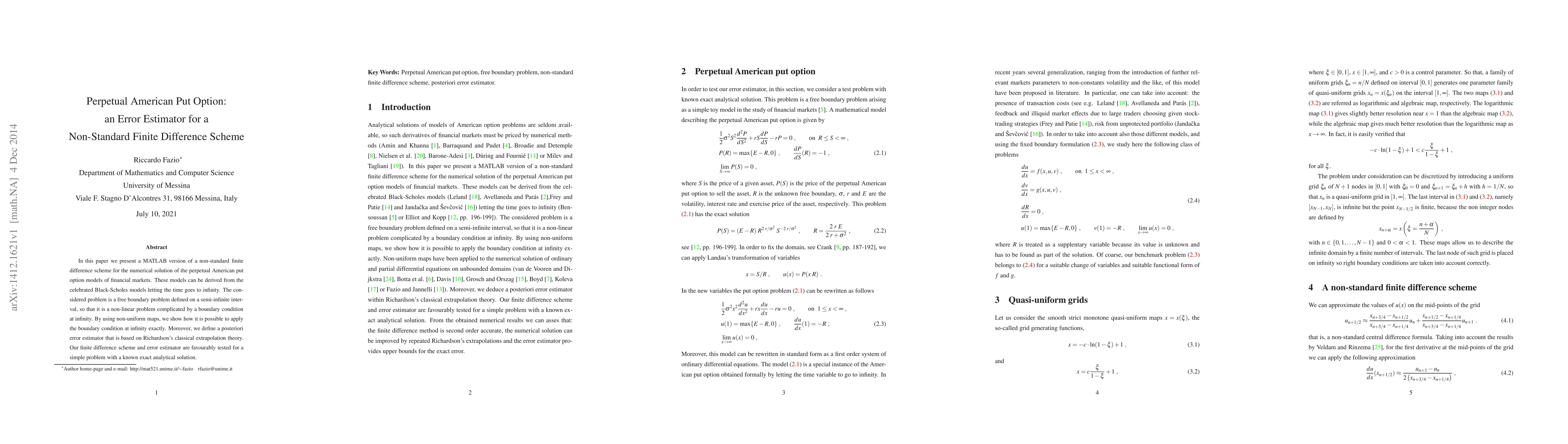 In this paper we present a MATLAB version of a non-standard finite difference scheme for the numerical solution of the perpetual American put option models of financial markets. These models can be derived from the celebrated Black-Scholes models letting the time goes to infinity. The considered problem is a free boundary problem defined on a semi-infinite interval, so that it is a non-linear problem complicated by a boundary condition at infinity. By using non-uniform maps, we show how it is possible to apply the boundary condition at infinity exactly. Moreover, we define a posteriori error estimator that is based on Richardson's classical extrapolation theory. Our finite difference scheme and error estimator are favourably tested for a simple problem with a known exact analytical solution.