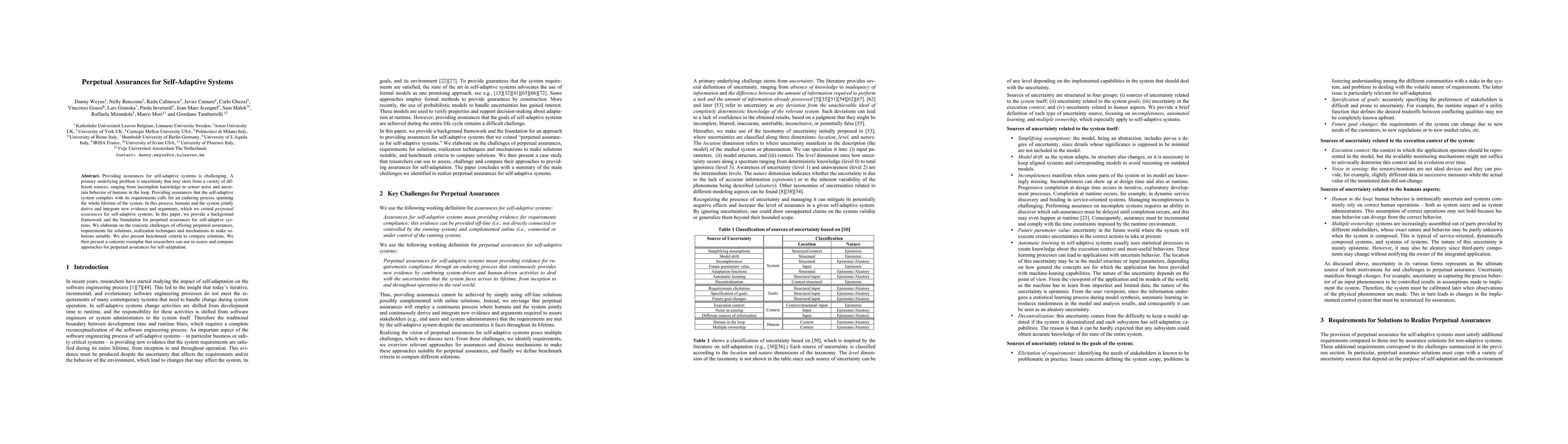 This paper introduces perpetual assurances for self-adaptive systems, a process for ensuring systems meet their requirements over their lifetime, addressing challenges like uncertainty and human behavior. It provides a framework and benchmark criteria to compare approaches and offers a concrete exemplar for research and assessment.