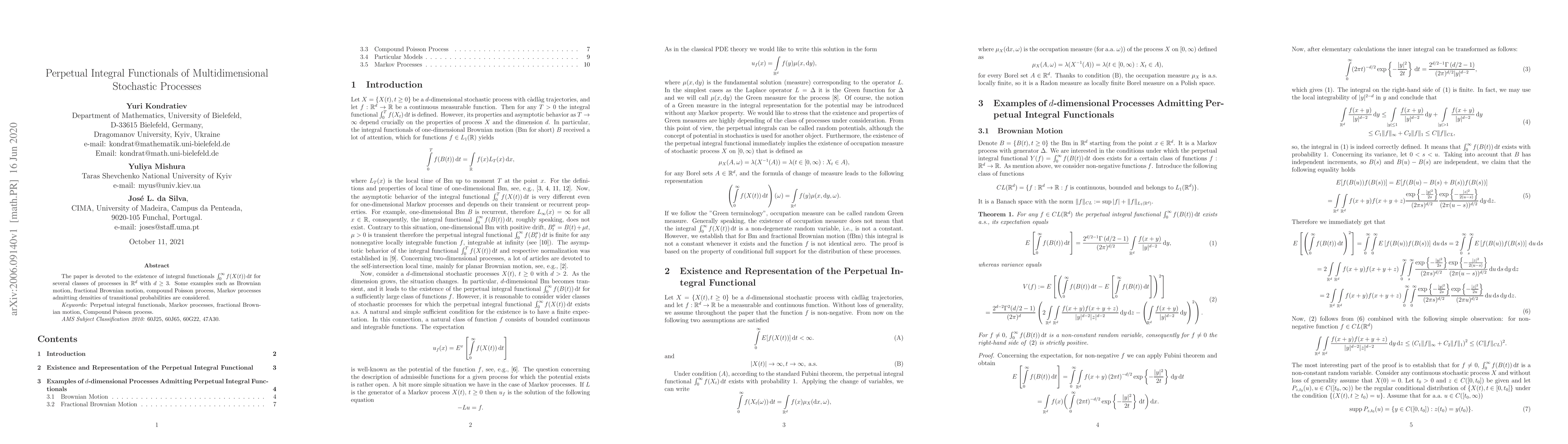This paper investigates the existence of perpetual integral functionals $\int_0^\infty f(X(t))\,{\mathrm{d}t}$ for various classes of multidimensional stochastic processes in $\mathbb{R}$ with $d\ge 3$, including examples like Brownian motion, fractional Brownian motion, compound Poisson processes, and Markov processes with transitional probability densities.