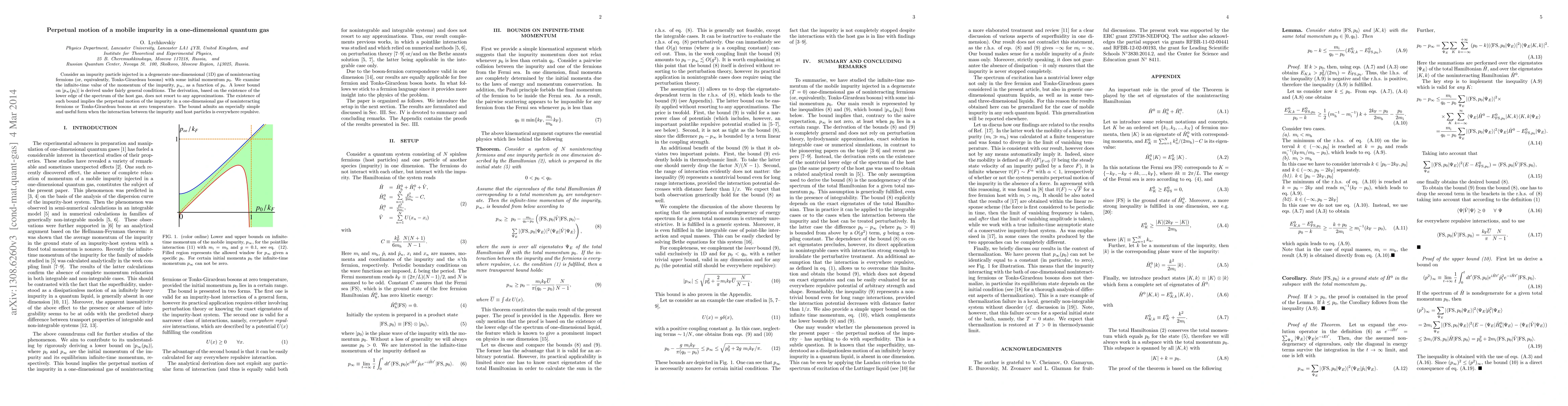 This paper investigates the perpetual motion of an impurity particle in a one-dimensional quantum gas of noninteracting fermions or Tonks-Girardeau bosons, deriving a lower bound on the impurity's momentum that implies its continuous motion at zero temperature. The derivation leverages the lower edge of the host gas spectrum without approximations, especially simplifying when impurity-host interactions are repulsive.