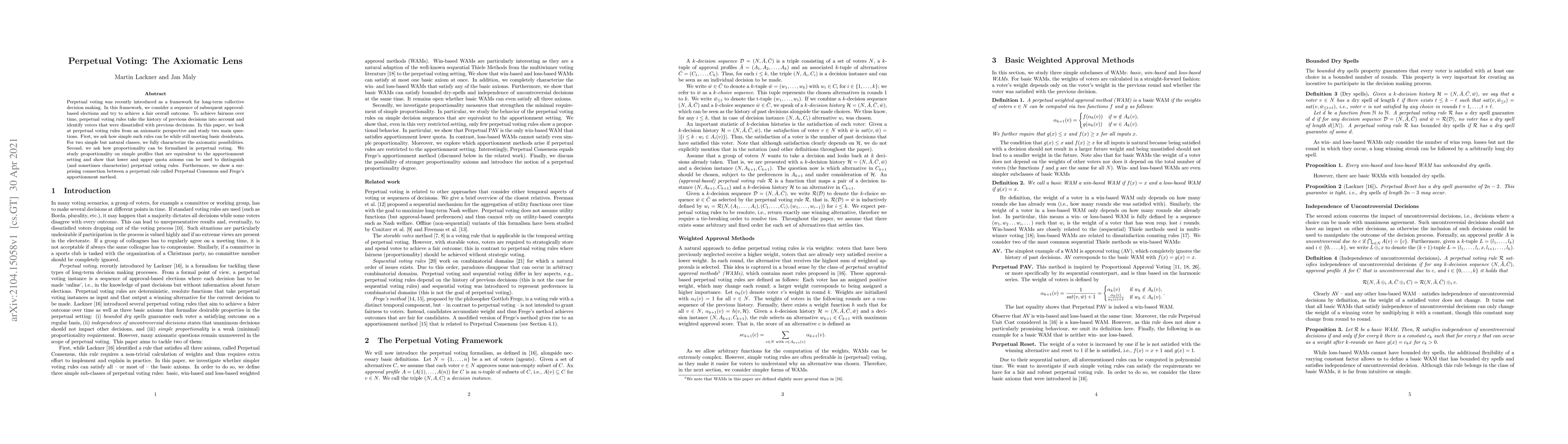 This paper examines perpetual voting, a framework for long-term collective decision making, through an axiomatic lens. It characterizes simple yet fair perpetual voting rules and explores the formalization of proportionality, revealing a surprising link between Perpetual Consensus and Frege's apportionment method.
