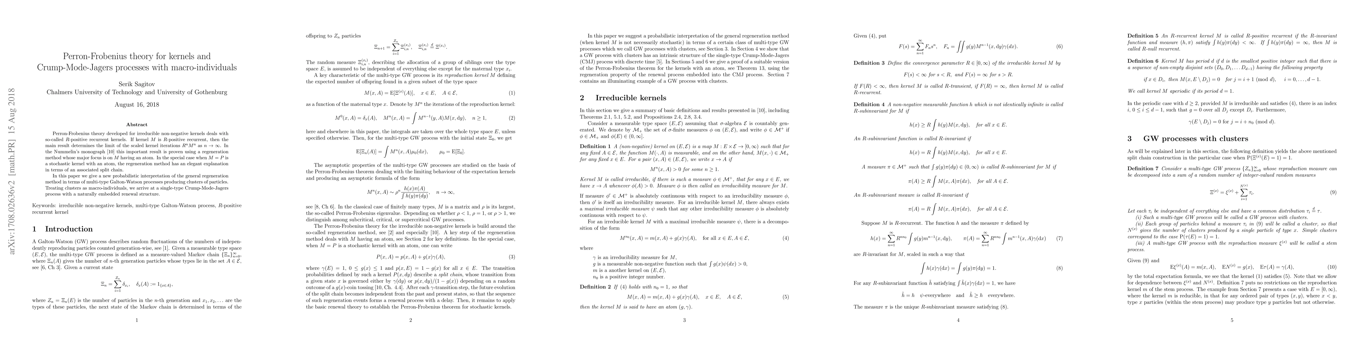 Perron-Frobenius theory developed for irreducible non-negative kernels deals with so-called $R$-positive recurrent kernels. If kernel $M$ is $R$-positive recurrent, then the main result determines the limit of the scaled kernel iterations $R^nM^n$ as $n\to\infty$. In the Nummelin's monograph this important result is proven using a regeneration method whose major focus is on $M$ having an atom. In the special case when $M=P$ is a stochastic kernel with an atom, the regeneration method has an elegant explaination in terms of an associated split chain. In this paper we give a new probabilistic interpretation of the general regeneration method in terms of multi-type Galton-Watson processes producing clusters of particles. Treating clusters as macro-individuals, we arrive at a single-type Crump-Mode-Jagers process with a naturally embedded renewal structure.