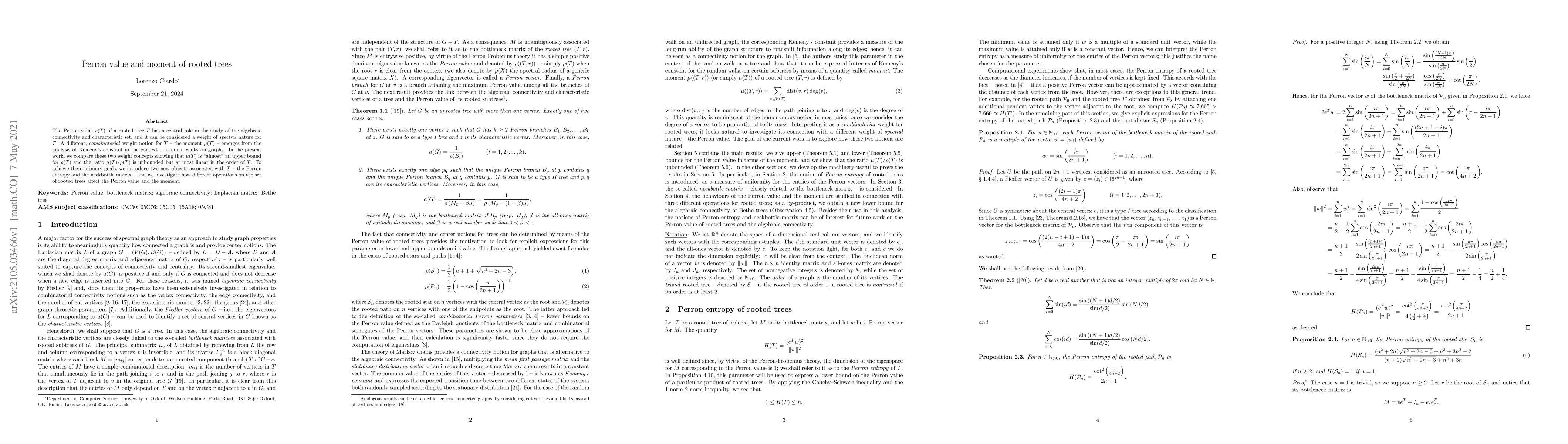 The Perron value $\rho(T)$ of a rooted tree $T$ has a central role in the study of the algebraic connectivity and characteristic set, and it can be considered a weight of spectral nature for $T$. A different, combinatorial weight notion for $T$ - the moment $\mu(T)$ - emerges from the analysis of Kemeny's constant in the context of random walks on graphs. In the present work, we compare these two weight concepts showing that $\mu(T)$ is "almost" an upper bound for $\rho(T)$ and the ratio $\mu(T)/\rho(T)$ is unbounded but at most linear in the order of $T$. To achieve these primary goals, we introduce two new objects associated with $T$ - the Perron entropy and the neckbottle matrix - and we investigate how different operations on the set of rooted trees affect the Perron value and the moment.