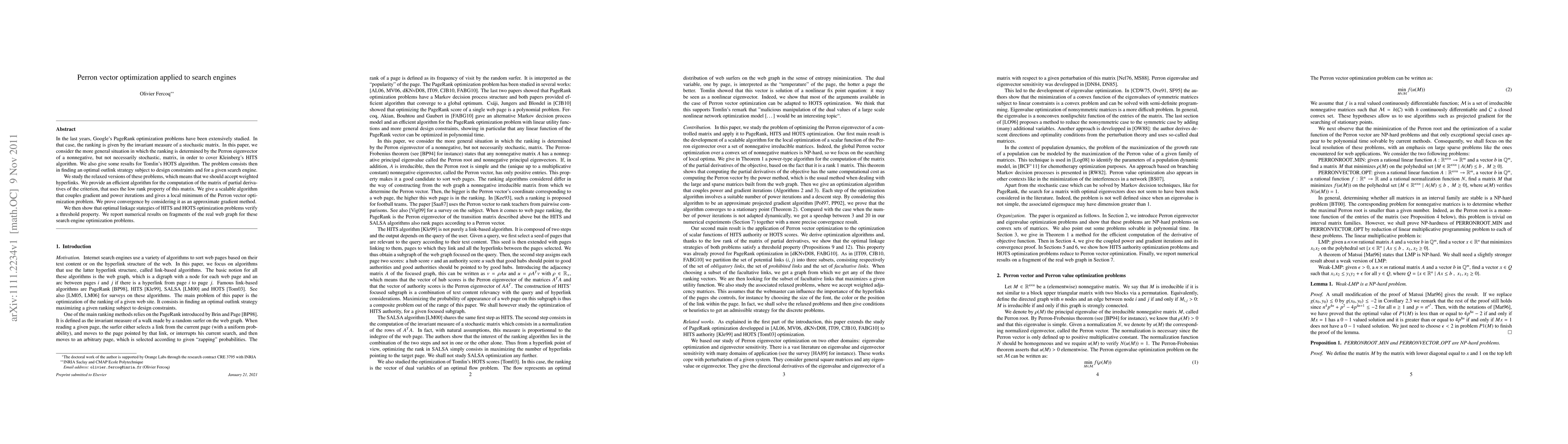 In the last years, Google's PageRank optimization problems have been extensively studied. In that case, the ranking is given by the invariant measure of a stochastic matrix. In this paper, we consider the more general situation in which the ranking is determined by the Perron eigenvector of a nonnegative, but not necessarily stochastic, matrix, in order to cover Kleinberg's HITS algorithm. We also give some results for Tomlin's HOTS algorithm. The problem consists then in finding an optimal outlink strategy subject to design constraints and for a given search engine. We study the relaxed versions of these problems, which means that we should accept weighted hyperlinks. We provide an efficient algorithm for the computation of the matrix of partial derivatives of the criterion, that uses the low rank property of this matrix. We give a scalable algorithm that couples gradient and power iterations and gives a local minimum of the Perron vector optimization problem. We prove convergence by considering it as an approximate gradient method. We then show that optimal linkage stategies of HITS and HOTS optimization problems verify a threshold property. We report numerical results on fragments of the real web graph for these search engine optimization problems.