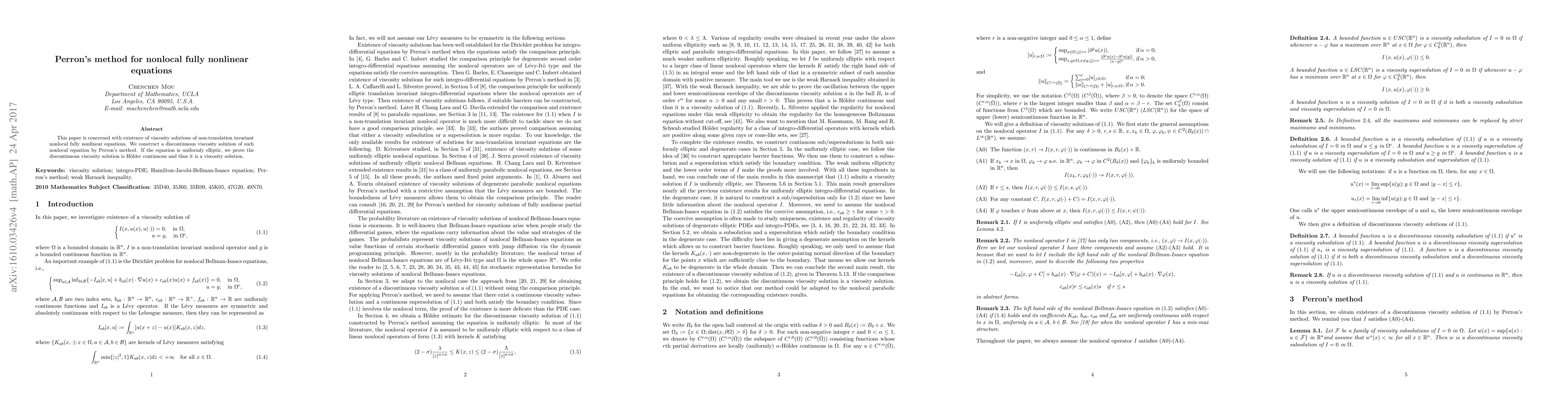 This paper establishes the existence of discontinuous viscosity solutions for non-translation invariant nonlocal fully nonlinear equations using Perron's method. For uniformly elliptic equations, it proves the solution is H\"older continuous and thus qualifies as a viscosity solution.