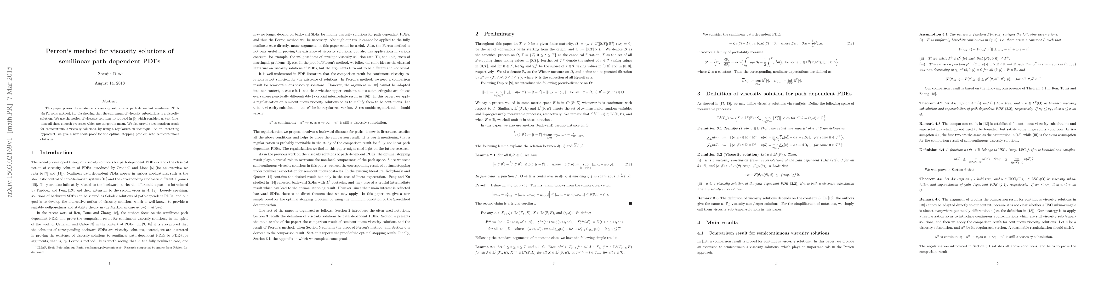 This paper establishes the existence of viscosity solutions for semilinear path dependent PDEs using Perron's method, demonstrating that the supremum of viscosity subsolutions is itself a viscosity solution. It also provides a comparison result and a new proof for the optimal stopping problem with semicontinuous obstacles.