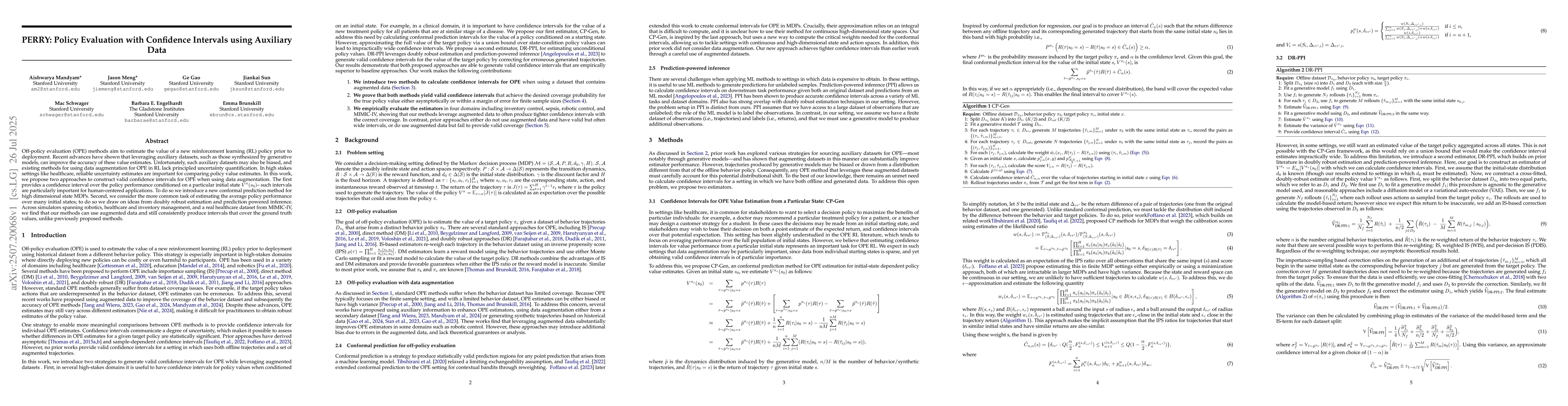 Off-policy evaluation (OPE) methods aim to estimate the value of a new reinforcement learning (RL) policy prior to deployment. Recent advances have shown that leveraging auxiliary datasets, such as those synthesized by generative models, can improve the accuracy of these value estimates. Unfortunately, such auxiliary datasets may also be biased, and existing methods for using data augmentation for OPE in RL lack principled uncertainty quantification. In high stakes settings like healthcare, reliable uncertainty estimates are important for comparing policy value estimates. In this work, we propose two approaches to construct valid confidence intervals for OPE when using data augmentation. The first provides a confidence interval over the policy performance conditioned on a particular initial state $V^{\pi}(s_0)$-- such intervals are particularly important for human-centered applications. To do so we introduce a new conformal prediction method for high dimensional state MDPs. Second, we consider the more common task of estimating the average policy performance over many initial states; to do so we draw on ideas from doubly robust estimation and prediction powered inference. Across simulators spanning robotics, healthcare and inventory management, and a real healthcare dataset from MIMIC-IV, we find that our methods can use augmented data and still consistently produce intervals that cover the ground truth values, unlike previously proposed methods.