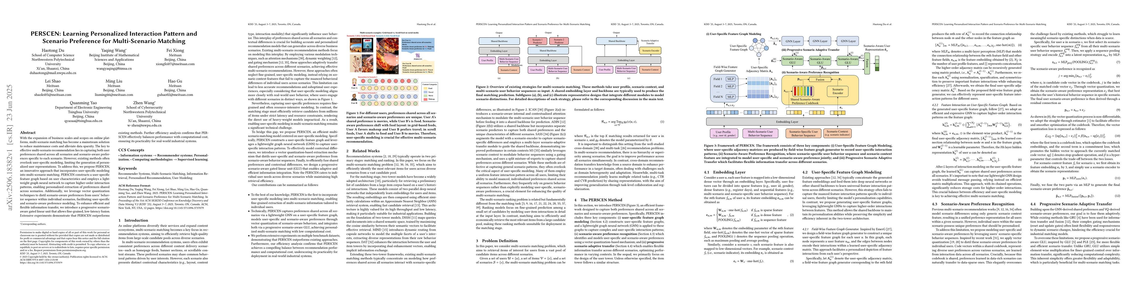 With the expansion of business scales and scopes on online platforms, multi-scenario matching has become a mainstream solution to reduce maintenance costs and alleviate data sparsity. The key to effective multi-scenario recommendation lies in capturing both user preferences shared across all scenarios and scenario-aware preferences specific to each scenario. However, existing methods often overlook user-specific modeling, limiting the generation of personalized user representations. To address this, we propose PERSCEN, an innovative approach that incorporates user-specific modeling into multi-scenario matching. PERSCEN constructs a user-specific feature graph based on user characteristics and employs a lightweight graph neural network to capture higher-order interaction patterns, enabling personalized extraction of preferences shared across scenarios. Additionally, we leverage vector quantization techniques to distil scenario-aware preferences from users' behavior sequence within individual scenarios, facilitating user-specific and scenario-aware preference modeling. To enhance efficient and flexible information transfer, we introduce a progressive scenario-aware gated linear unit that allows fine-grained, low-latency fusion. Extensive experiments demonstrate that PERSCEN outperforms existing methods. Further efficiency analysis confirms that PERSCEN effectively balances performance with computational cost, ensuring its practicality for real-world industrial systems.