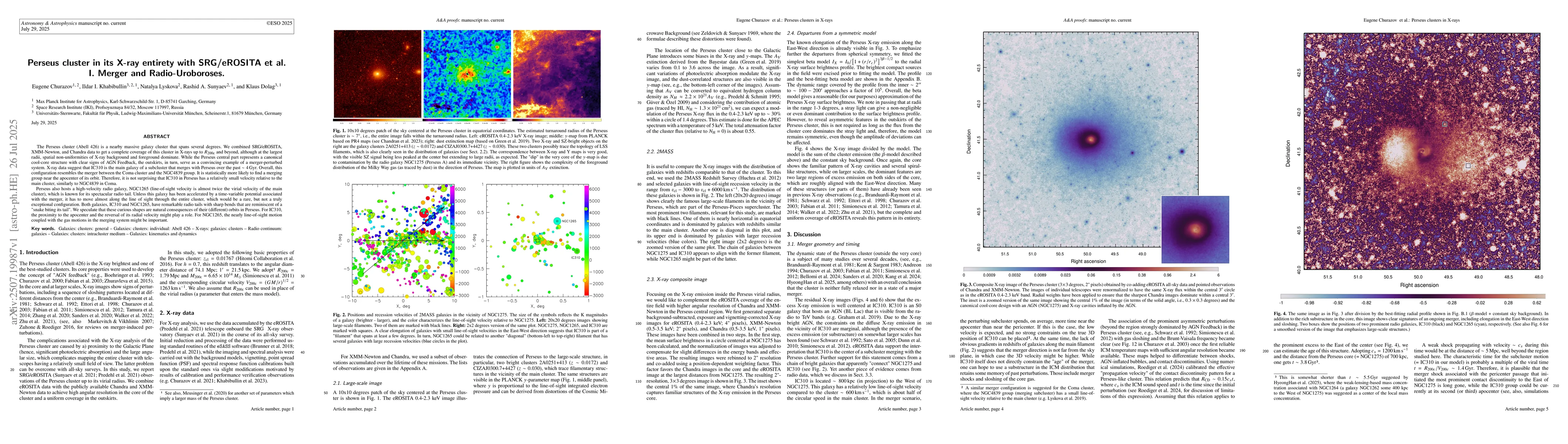 The Perseus cluster (Abell 426) is a nearby massive galaxy cluster that spans several degrees. We combined SRG/eROSITA, XMM-Newton, and Chandra data to get a complete coverage of this cluster in X-rays up to $R_{\rm 200c}$ and beyond, although at the largest radii, spatial non-uniformities of X-ray background and foreground dominate. While the Perseus central part represents a canonical cool-core structure with clear signs of AGN Feedback, the outskirts, in turn, serve as a convincing example of a merger-perturbed system. X-ray data suggest that IC310 is the main galaxy of a subcluster that merges with Perseus over the past $\sim 4\,{\rm Gyr}$. Overall, this configuration resembles the merger between the Coma cluster and the NGC4839 group. It is statistically more likely to find a merging group near the apocenter of its orbit. Therefore, it is not surprising that IC310 in Perseus has a relatively small velocity relative to the main cluster, similarly to NGC4839 in Coma. Perseus also hosts a high-velocity radio galaxy, NGC1265 (line-of-sight velocity is almost twice the virial velocity of the main cluster), which is known for its spectacular radio tail. Unless this galaxy has been accelerated by a time-variable potential associated with the merger, it has to move almost along the line of sight through the entire cluster, which would be a rare, but not a truly exceptional configuration. Both galaxies, IC310 and NGC1265, have remarkable radio tails with sharp bends that are reminiscent of a "snake biting its tail". We speculate that these curious shapes are natural consequences of their (different) orbits in Perseus. For IC310, the proximity to the apocenter and the reversal of its radial velocity might play a role. For NGC1265, the nearly line-of-sight motion coupled with the gas motions in the merging system might be important.