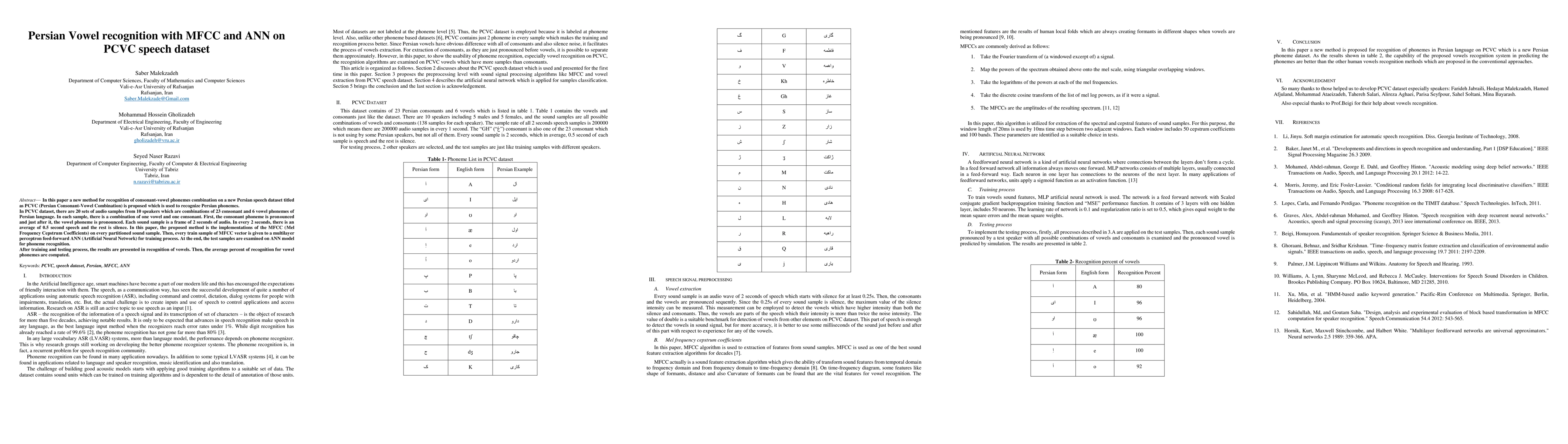 This paper proposes a method for recognizing Persian consonant-vowel phoneme combinations using MFCC and ANN on the PCVC dataset. The method extracts MFCC features from audio samples and trains a multilayer perceptron ANN for vowel recognition, achieving a computed average percent of vowel recognition.