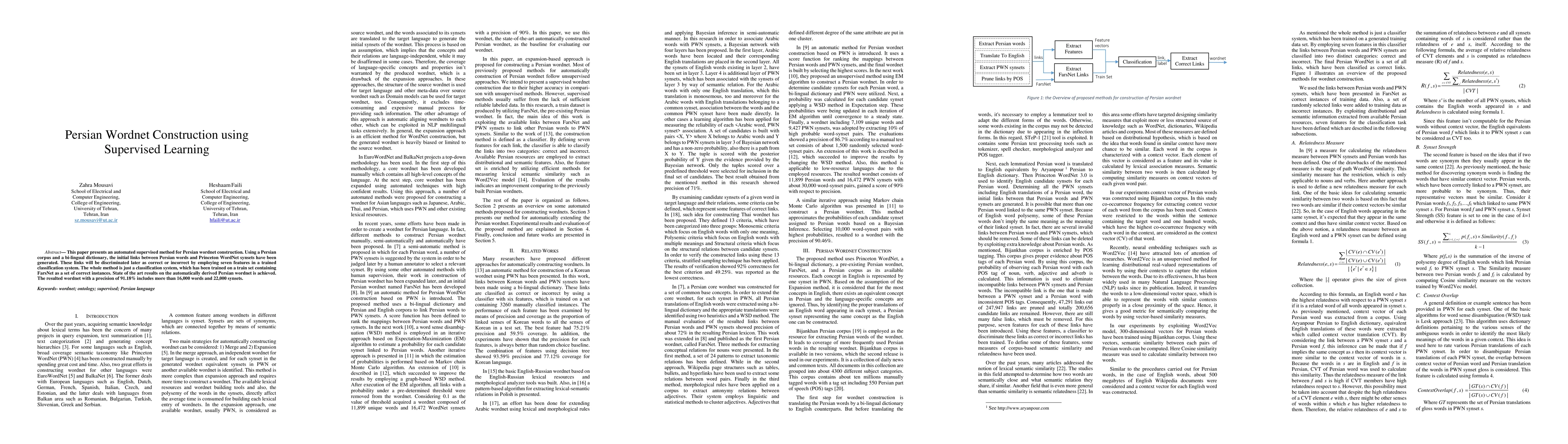 The paper introduces a supervised learning approach for Persian Wordnet construction, defining seven features for link classification and demonstrating a high-precision, large-scale Persian Wordnet.