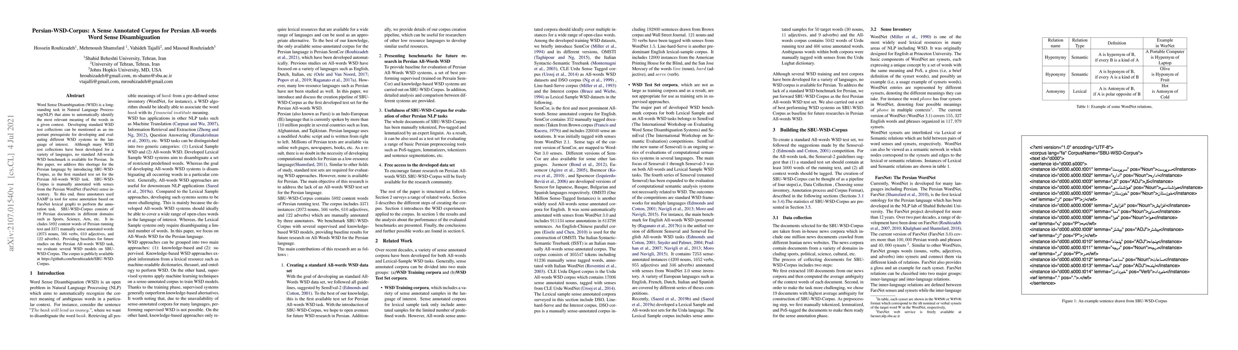 This paper introduces SBU-WSD-Corpus, the first Persian All-words Word Sense Disambiguation benchmark, consisting of 19 documents with 5892 content words and 3371 manually annotated senses based on FarsNet. The corpus is evaluated using several WSD models to provide baselines for future research.