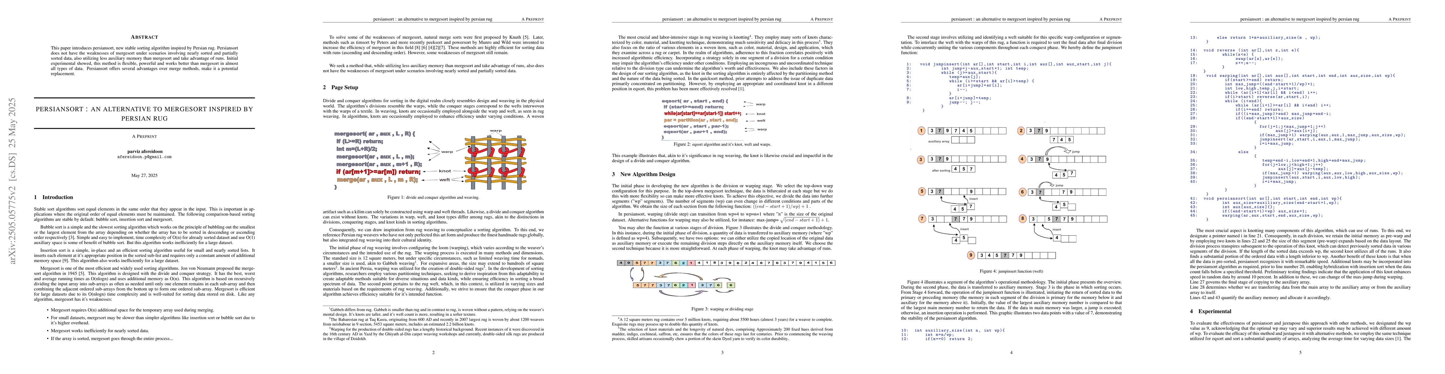 The paper introduces persiansort, a new stable sorting algorithm inspired by Persian rug patterns, claiming to address weaknesses of mergesort in nearly and partially sorted data scenarios.