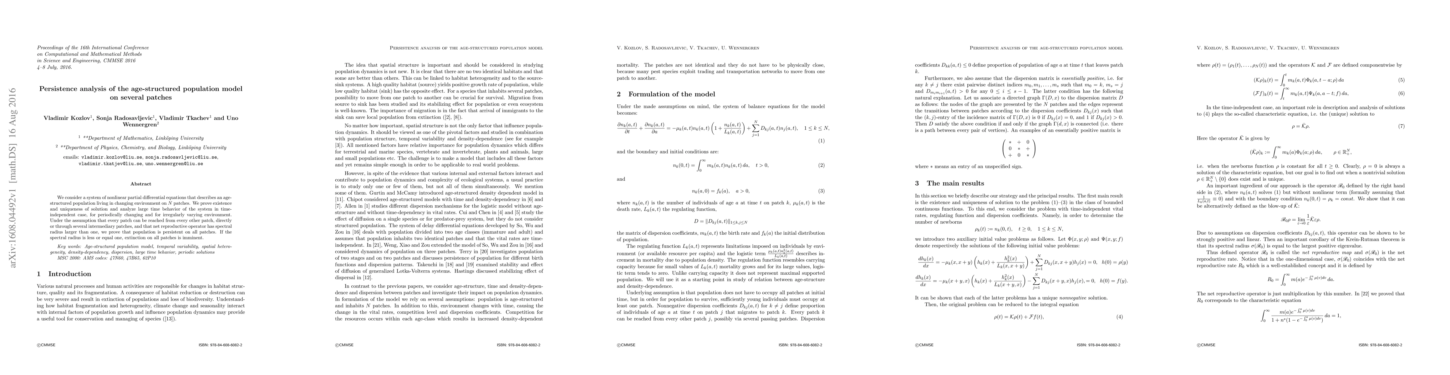 We consider a system of nonlinear partial differential equations that describes an age-structured population living in changing environment on $N$ patches. We prove existence and uniqueness of solution and analyze large time behavior of the system in time-independent case, for periodically changing and for irregularly varying environment. Under the assumption that every patch can be reached from every other patch, directly or through several intermediary patches, and that net reproductive operator has spectral radius larger than one, we prove that population is persistent on all patches. If the spectral radius is less or equal one, extinction on all patches is imminent.