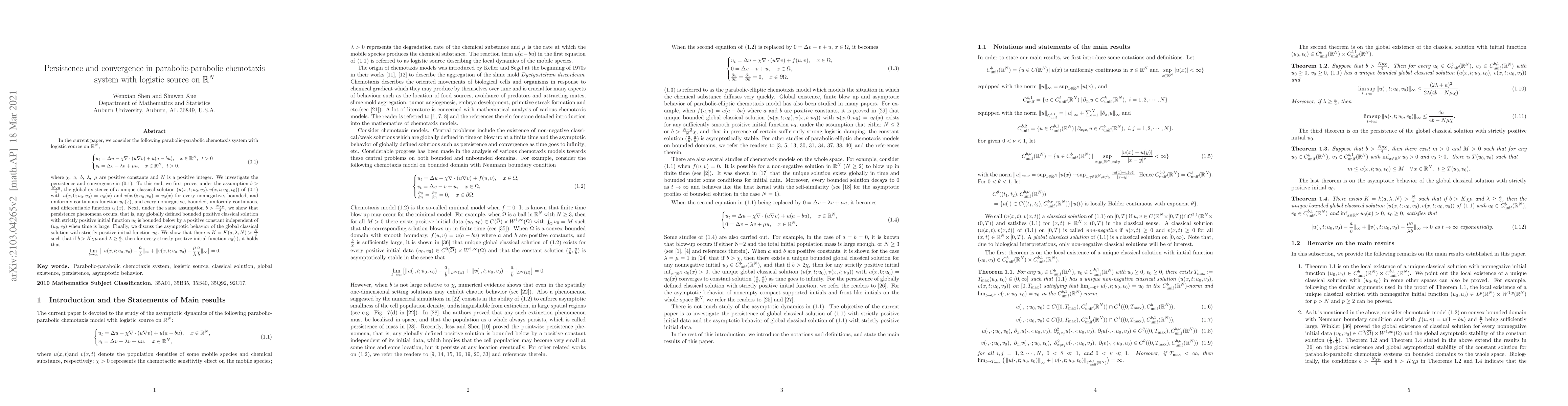 In the current paper, we consider the following parabolic-parabolic chemotaxis system with logistic source on $\mathbb{R}^{N}$, \begin{equation} \begin{cases} u_t=\Delta u-\chi\nabla\cdot ( u\nabla v) + u(a-bu),\quad x\in\mathbb{R}^{N}\,\,\, t>0\cr {v_t}=\Delta v -\lambda v+\mu u,\quad x\in \mathbb{R}^{N}\,\,\, t>0 \end{cases}(1) \end{equation} where $\chi, \ a,\ b,\ \lambda,\ \mu$ are positive constants and $N$ is a positive integer. We investigate the persistence and convergence in (1). To this end, we first prove, under the assumption $b>\frac{N\chi\mu}{4}$, the global existence of a unique classical solution $(u(x,t;u_0, v_0),v(x,t;u_0, v_0))$ of (1) with $u(x,0;u_0, v_0)=u_0(x)$ and $v(x,0;u_0, v_0)=v_0(x)$ for every nonnegative, bounded, and uniformly continuous function $u_0(x)$, and every nonnegative, bounded, uniformly continuous, and differentiable function $v_0(x)$. Next, under the same assumption $b>\frac{N\chi\mu}{4}$, we show that persistence phenomena occurs, that is, any globally defined bounded positive classical solution with strictly positive initial function $u_0$ is bounded below by a positive constant independent of $(u_0, v_0)$ when time is large. Finally, we discuss the asymptotic behavior of the global classical solution with strictly positive initial function $u_0$. We show that there is $K=K(a,\lambda,N)>\frac{N}{4}$ such that if $b>K \chi\mu$ and $\lambda\geq \frac{a}{2}$, then for every strictly positive initial function $u_0(\cdot)$, it holds that $$\lim_{t\to\infty}\big[\|u(x,t;u_0, v_0)-\frac{a}{b}\|_{\infty}+\|v(x,t;u_0, v_0)-\frac{\mu}{\lambda}\frac{a}{b}\|_{\infty}\big]=0.$$