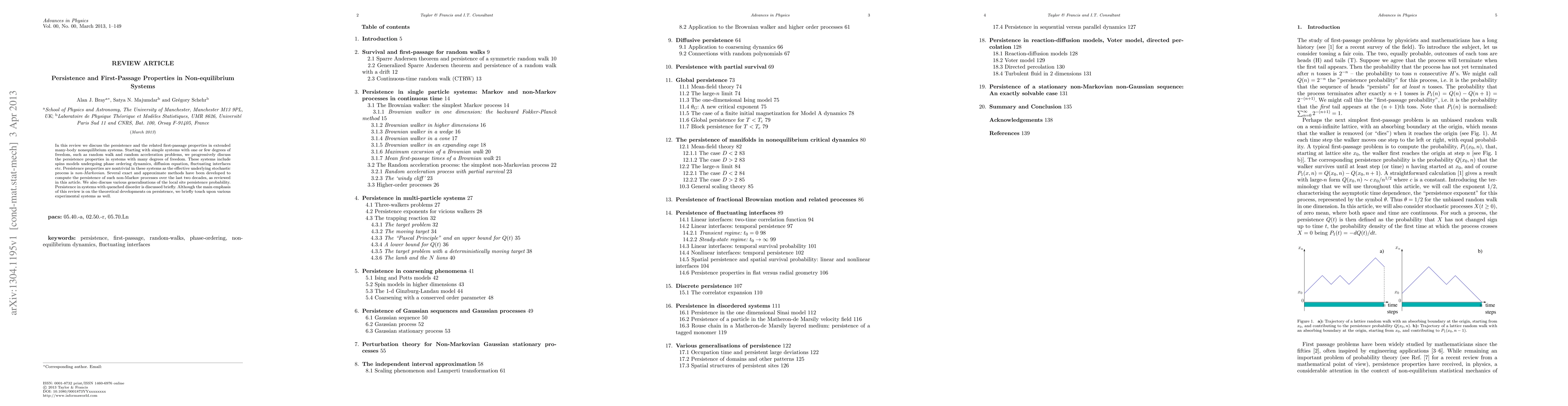 The paper reviews persistence and first-passage properties in non-equilibrium systems, discussing simple systems and progressing to many-body systems, including spin models, diffusion equations, and fluctuating interfaces.