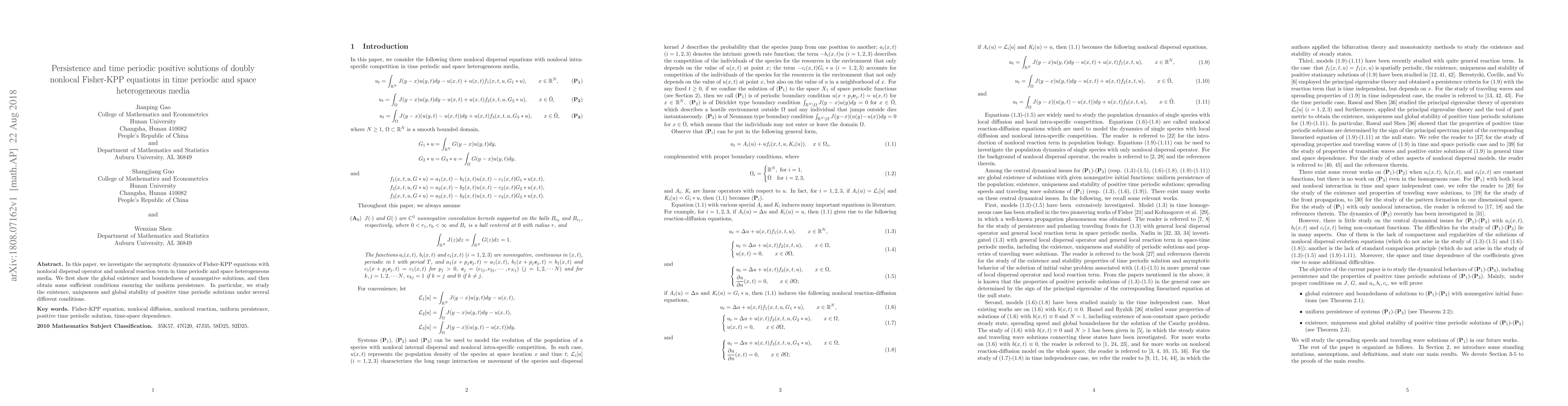 This paper examines the asymptotic dynamics of doubly nonlocal Fisher-KPP equations in time-periodic and space-heterogeneous environments. It establishes the global existence and boundedness of nonnegative solutions and explores conditions for uniform persistence and the existence, uniqueness, and stability of positive time periodic solutions.