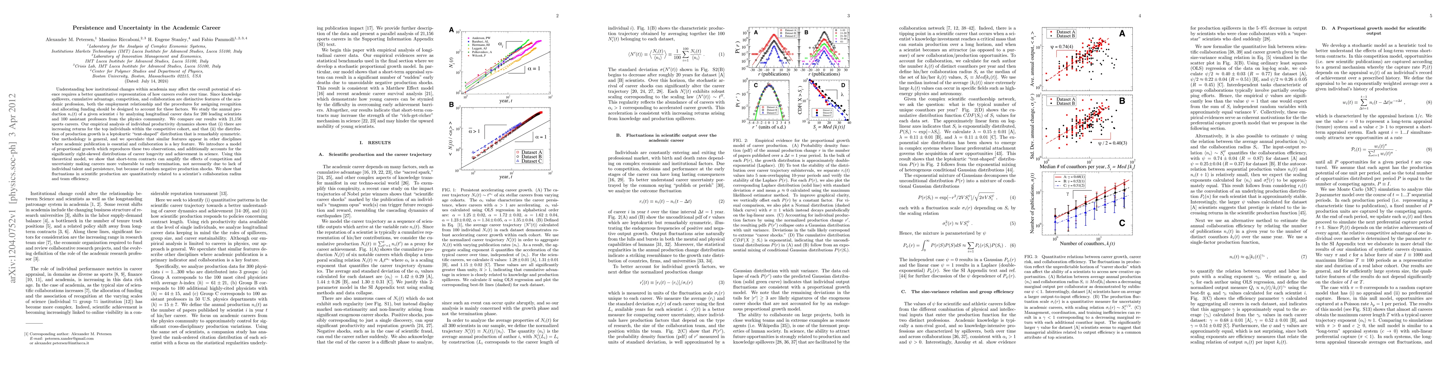 Understanding how institutional changes within academia may affect the overall potential of science requires a better quantitative representation of how careers evolve over time. Since knowledge spillovers, cumulative advantage, competition, and collaboration are distinctive features of the academic profession, both the employment relationship and the procedures for assigning recognition and allocating funding should be designed to account for these factors. We study the annual production n_{i}(t) of a given scientist i by analyzing longitudinal career data for 200 leading scientists and 100 assistant professors from the physics community. We compare our results with 21,156 sports careers. Our empirical analysis of individual productivity dynamics shows that (i) there are increasing returns for the top individuals within the competitive cohort, and that (ii) the distribution of production growth is a leptokurtic "tent-shaped" distribution that is remarkably symmetric. Our methodology is general, and we speculate that similar features appear in other disciplines where academic publication is essential and collaboration is a key feature. We introduce a model of proportional growth which reproduces these two observations, and additionally accounts for the significantly right-skewed distributions of career longevity and achievement in science. Using this theoretical model, we show that short-term contracts can amplify the effects of competition and uncertainty making careers more vulnerable to early termination, not necessarily due to lack of individual talent and persistence, but because of random negative production shocks. We show that fluctuations in scientific production are quantitatively related to a scientist's collaboration radius and team efficiency.