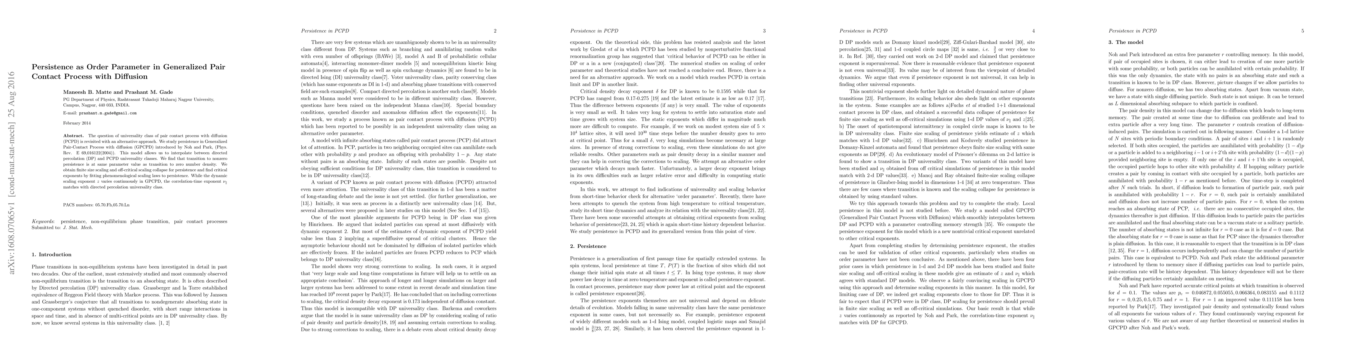 This paper investigates the Generalized Pair-Contact Process with diffusion (GPCPD) to determine its universality class, finding that the transition to nonzero persistence occurs at the same parameter value as the transition to zero number density. The study reveals that the correlation-time exponent matches the directed percolation universality class despite continuous variation in the dynamic scaling exponent.