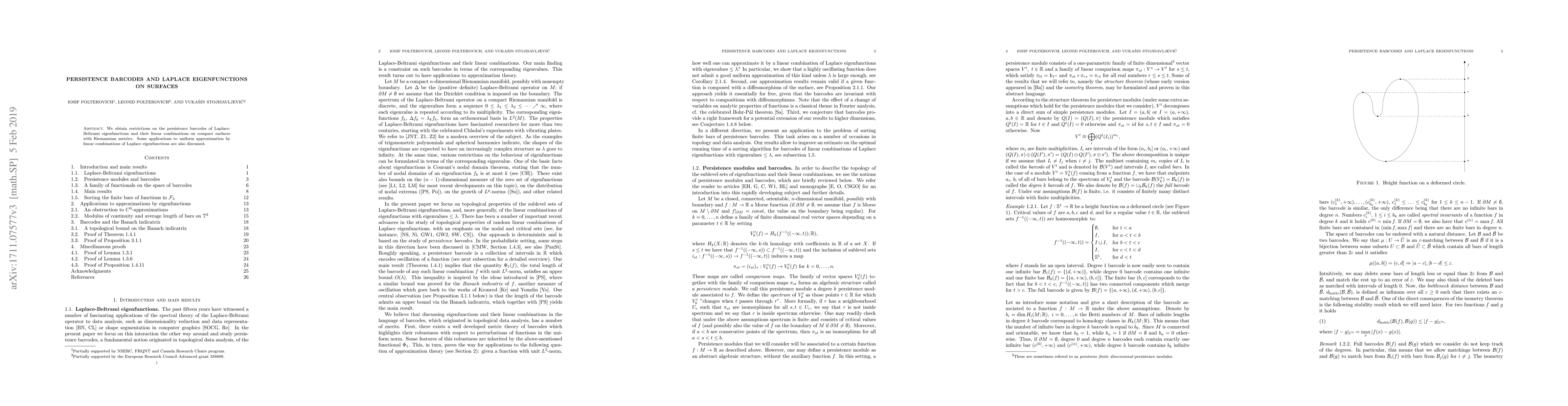 Summary: This paper investigates constraints on the persistence barcodes of Laplace-Beltrami eigenfunctions and their linear combinations on compact Riemannian surfaces, and explores applications to the uniform approximation using these eigenfunctions.
