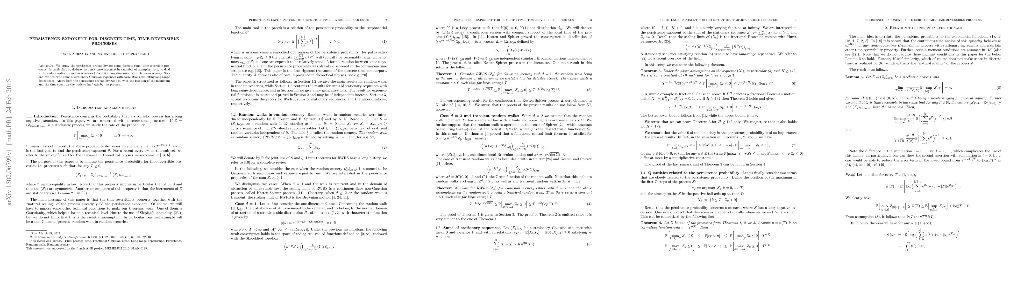 This paper investigates the persistence probability and the persistence exponent for discrete-time, time-reversible processes, focusing on random walks in Gaussian scenery and sums of long-range dependent Gaussian sequences, while also analyzing the position of the maximum and time spent in positive values.